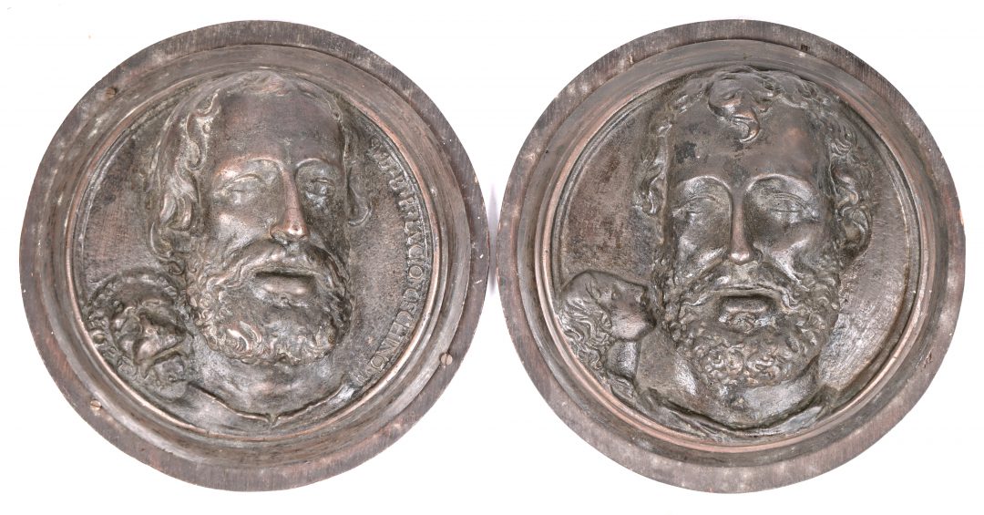 Two bronze portraits in high relief. One of the panels bears the text 'SVB P P Lucio Cechino'.