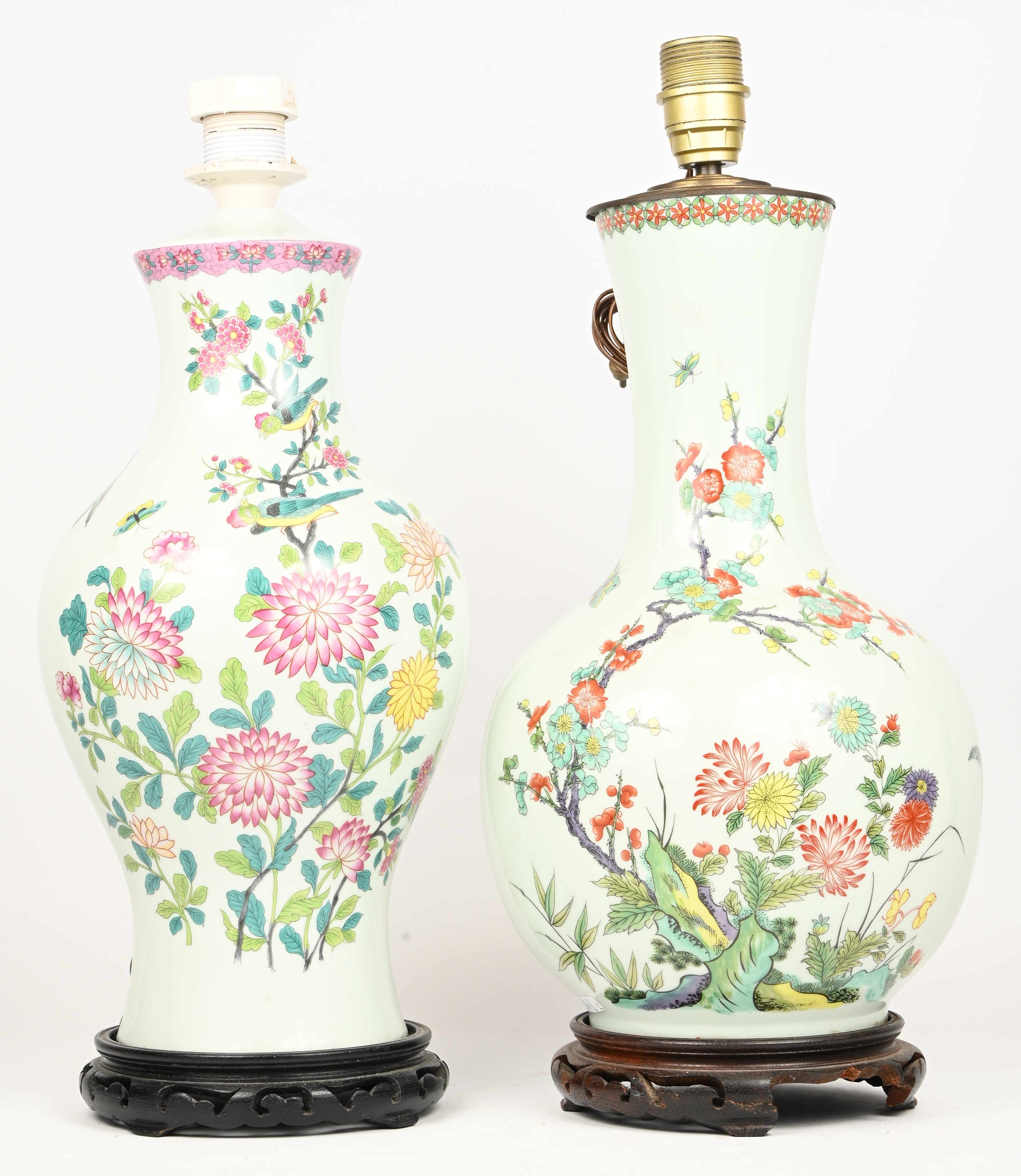 A table lamp with a Chinese-style base, hand-painted decoration of fauna and flora on a salmon pink background. -