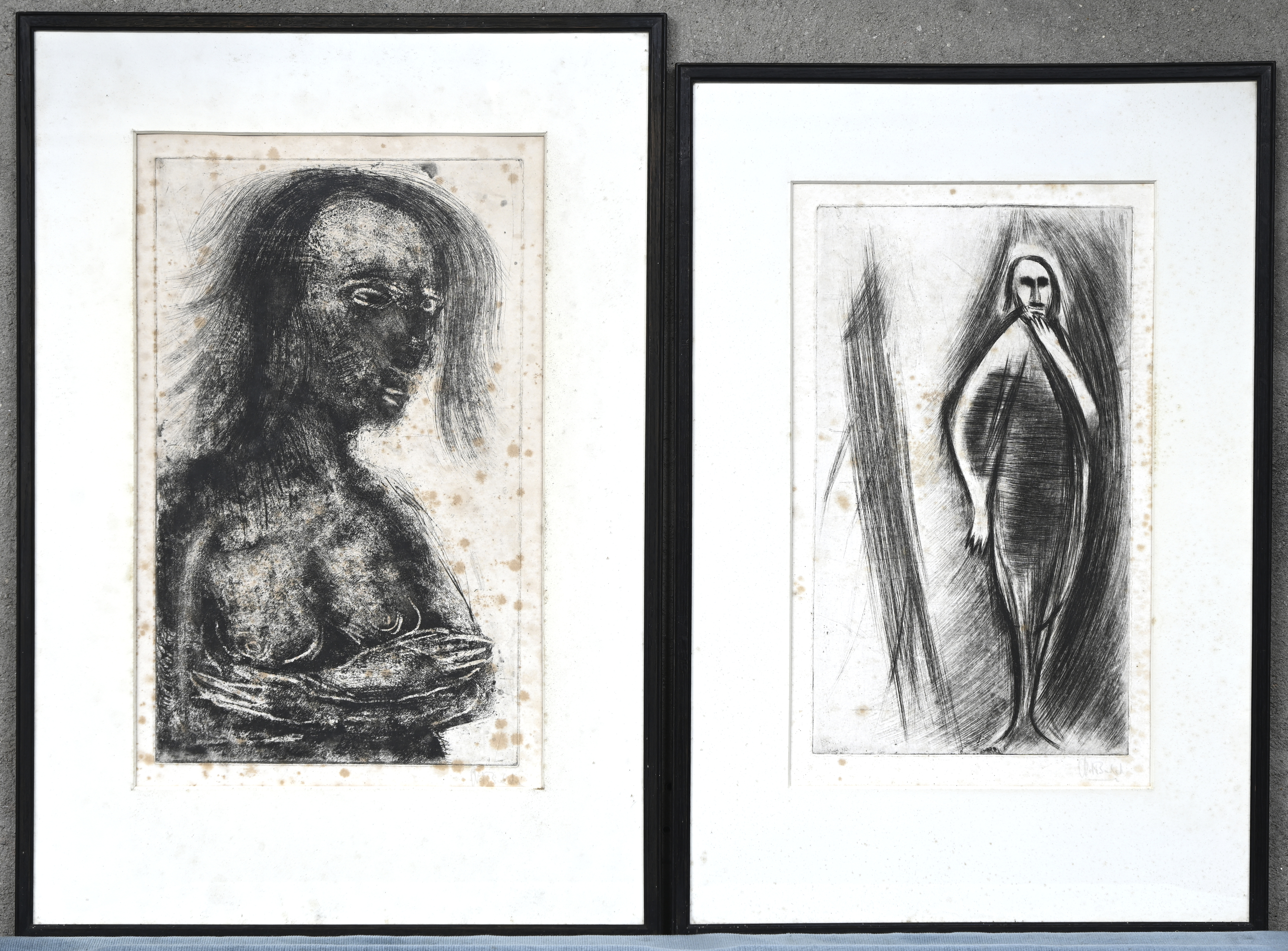 "Street characters". A drawing, mixed media on paper. Signed at the bottom. On the reverse side, a watercolor painting of a lady sitting on a chair. -