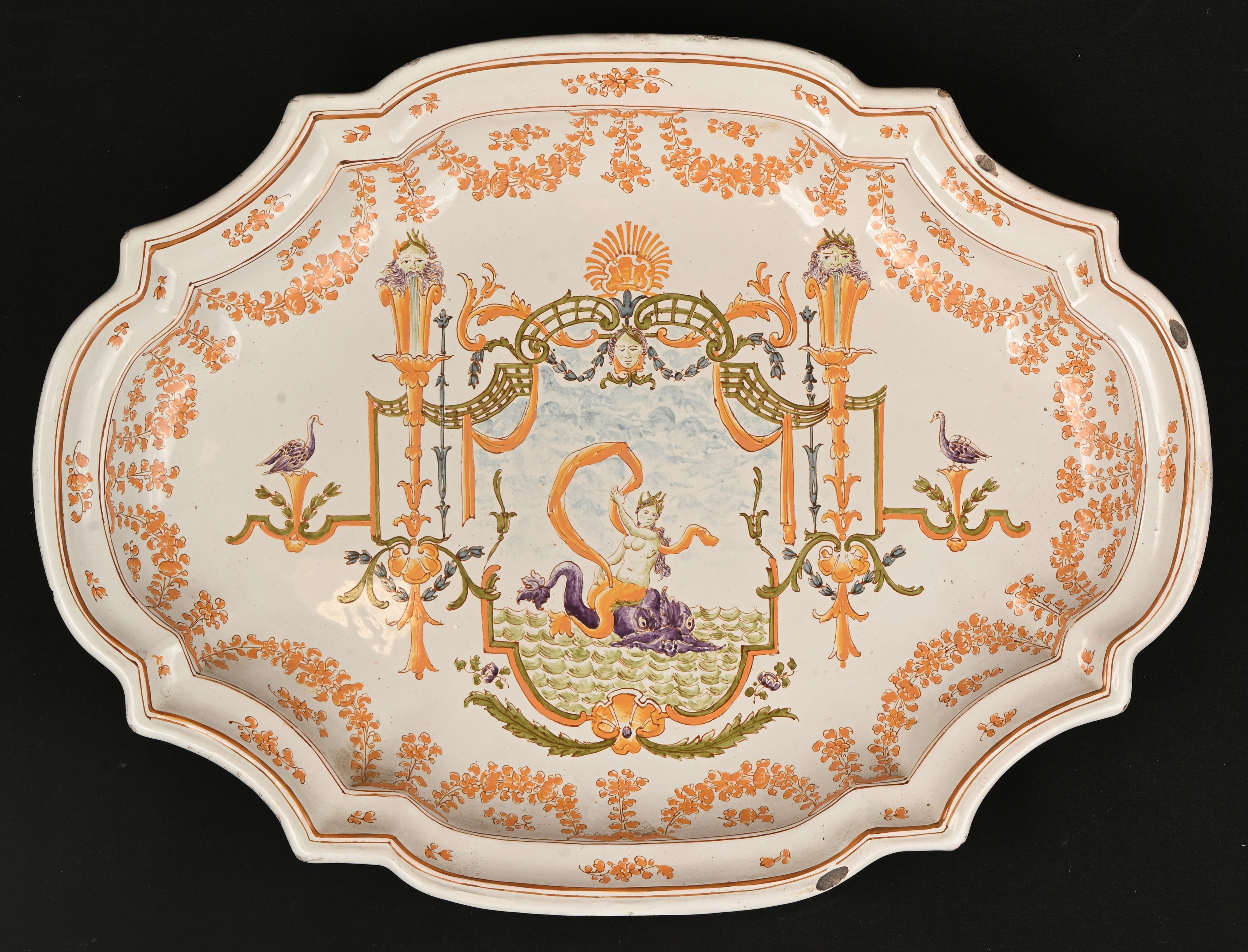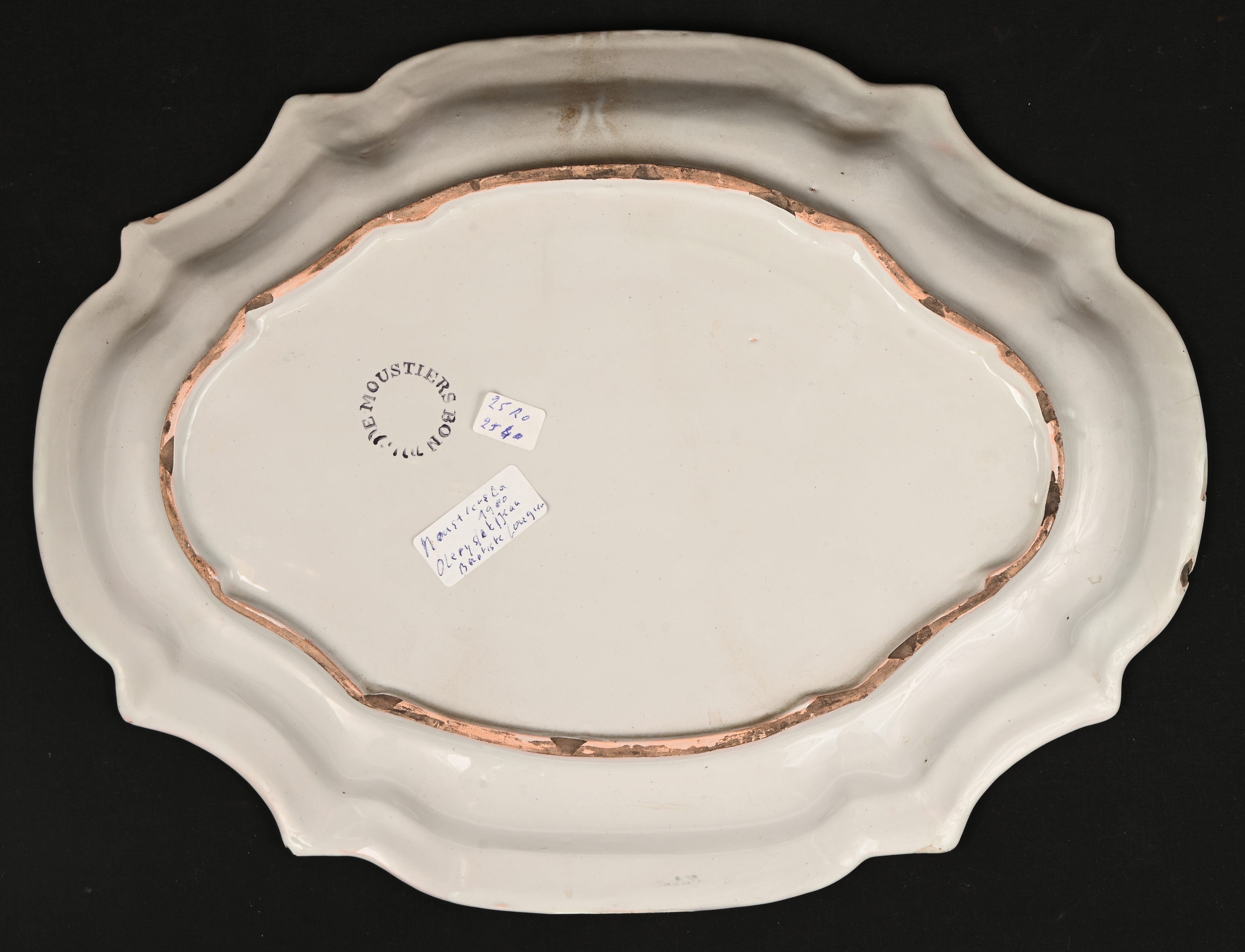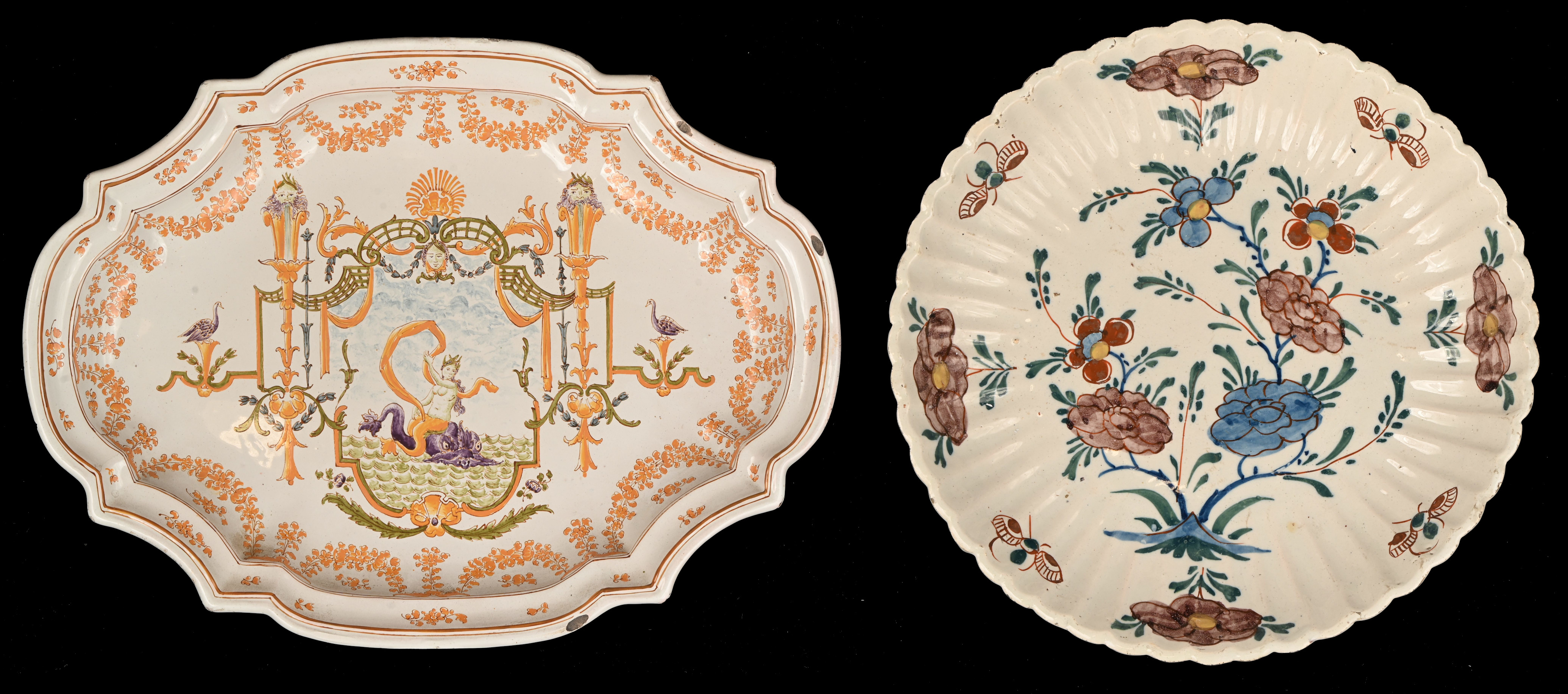 Twee Franse sierborden van meerkleurig aardewerk, medio 1900. Eén is gemerkt ‘Le Moustiers Bon’.