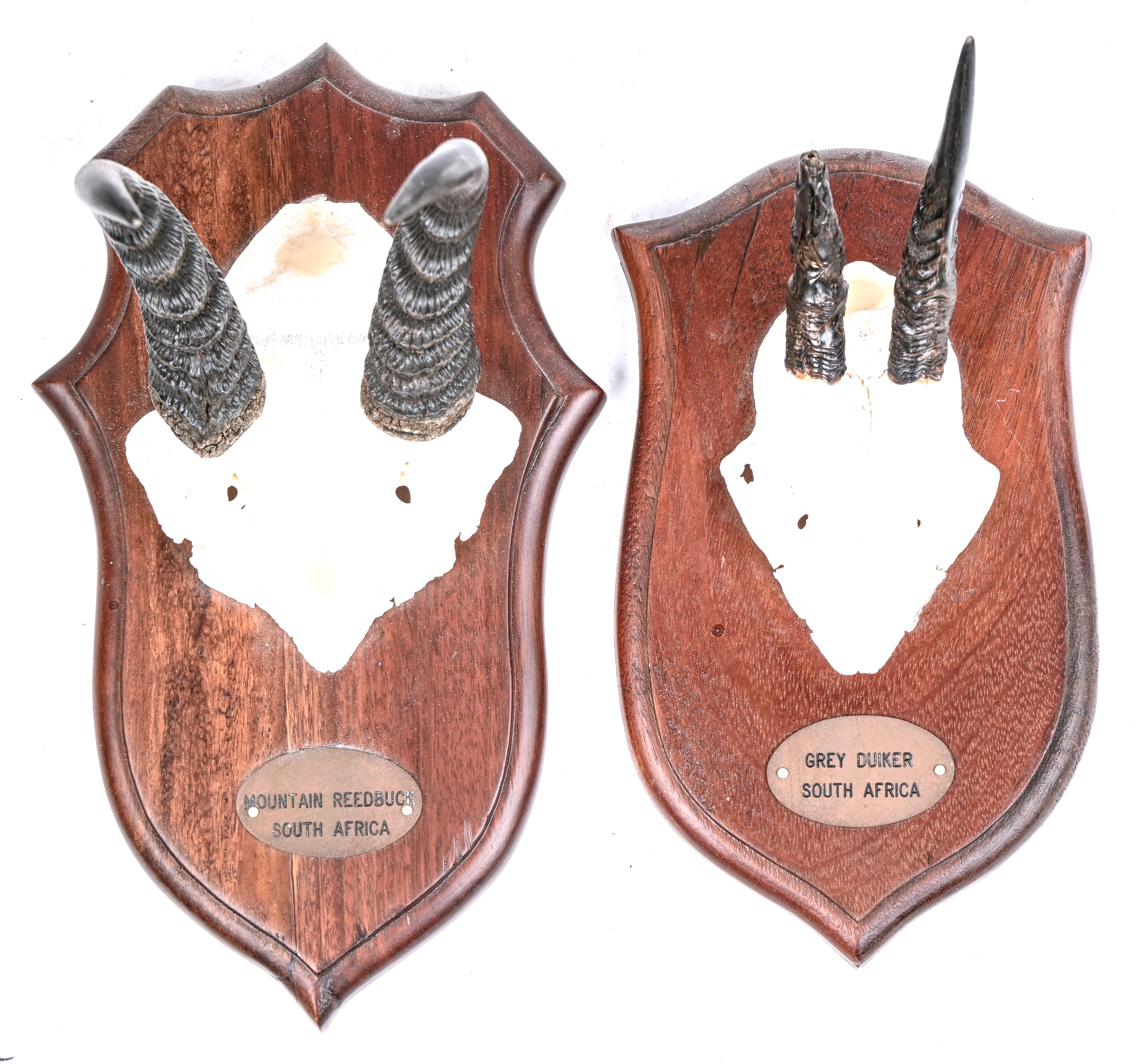 Two antlers on shields from a mountain reedbuck and a common duiker. African antelopes, shot in South Africa.