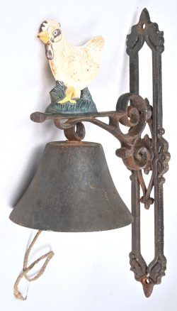 A cast iron bell with polychrome grumpy chicken. -