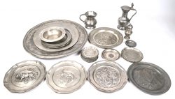 #241Een groot lot tin, 10,2 kg, bestaande uit 25 schalen/bordjes, 2 kannen en een strooier, toegevoegd 1 sierbord en 3 kleine bordjes met tinkleur.