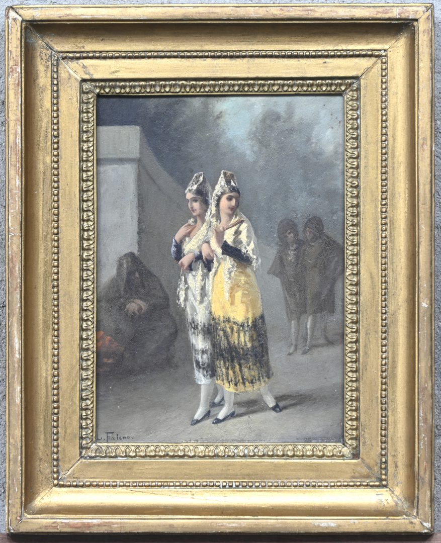 “Two young women in 19th-century Spanish dress,” oil on panel. Signed L. Faleno.