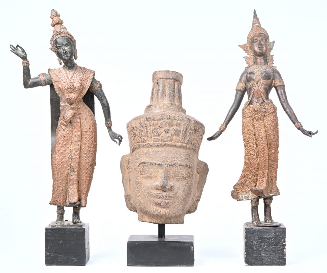 Twee kunstbronzen beelden van Thaise danseressen op houten sokkel, toegevoegd een kunststoffen Boeddha hoofd.