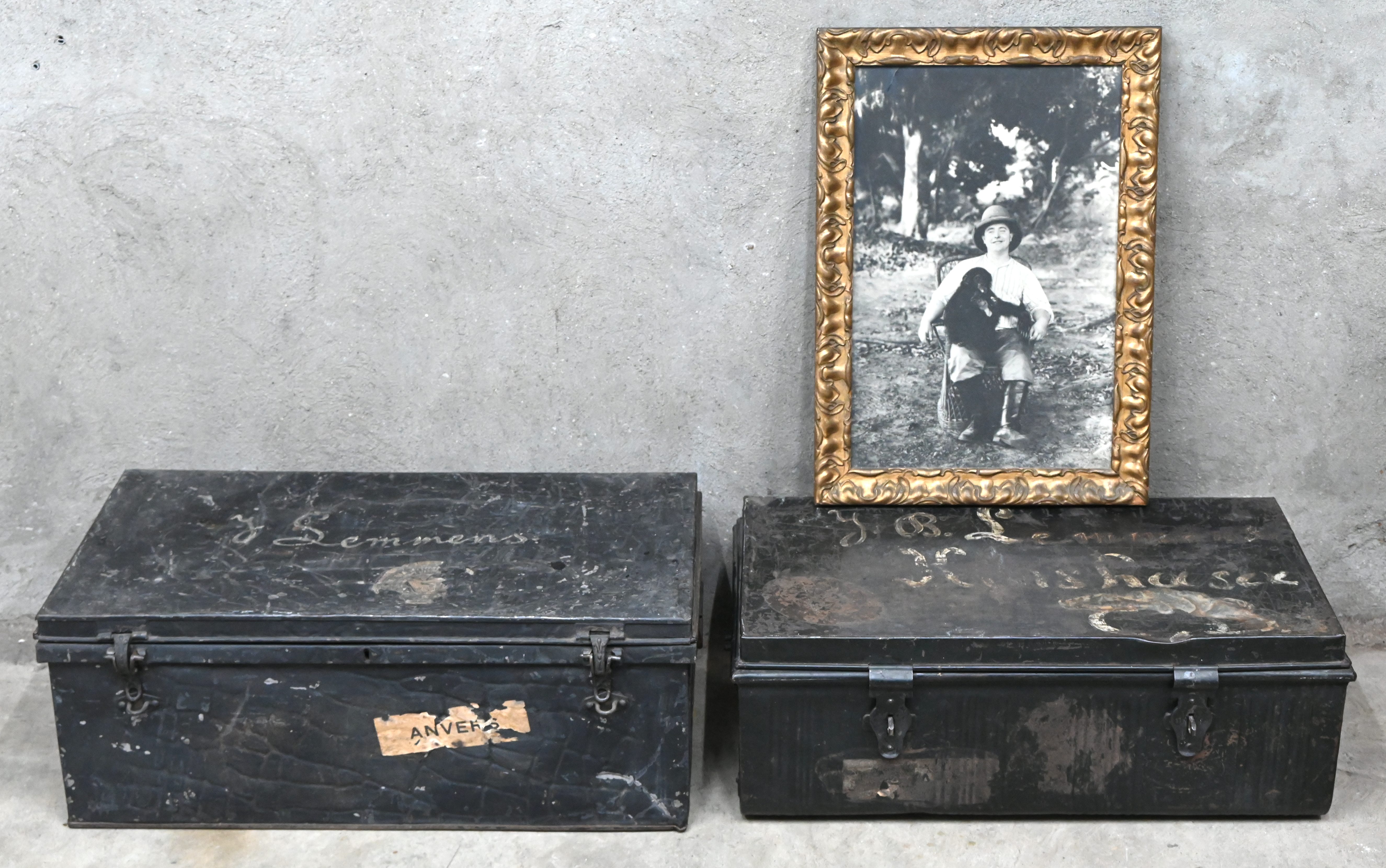 Two metal traveling trunks with a colonial history. The name J. Lemmens, Kinshasa is engraved on the lid. Included is a photo of the colonial figure with two monkeys on his lap.