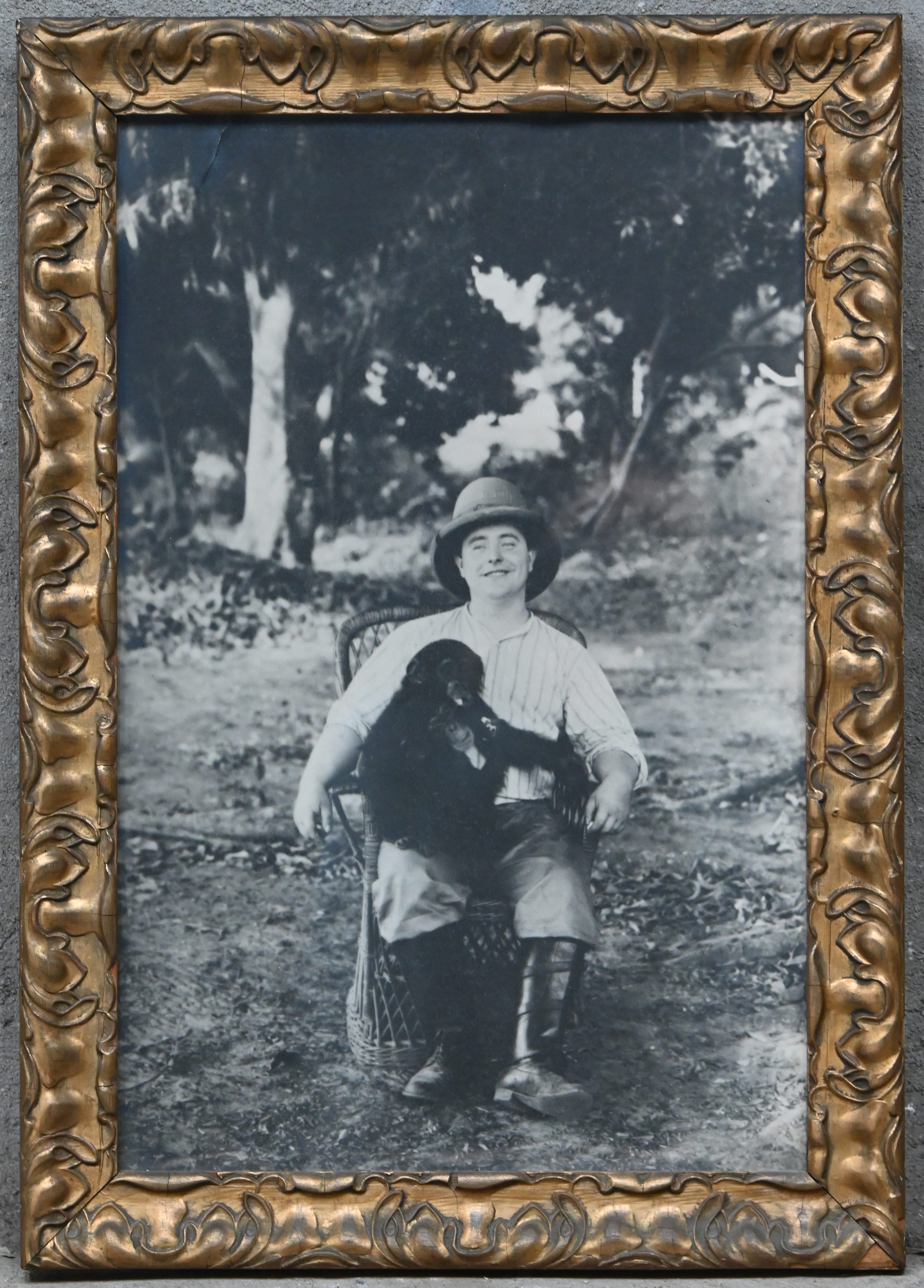 Twee metalen hutkoffers met een koloniaal verleden. Op het deksel staat de naam J. Lemmens, Kinshasa. Toegevoegd een foto van de koloniaal in kwestie met twee apen op zijn schoot.