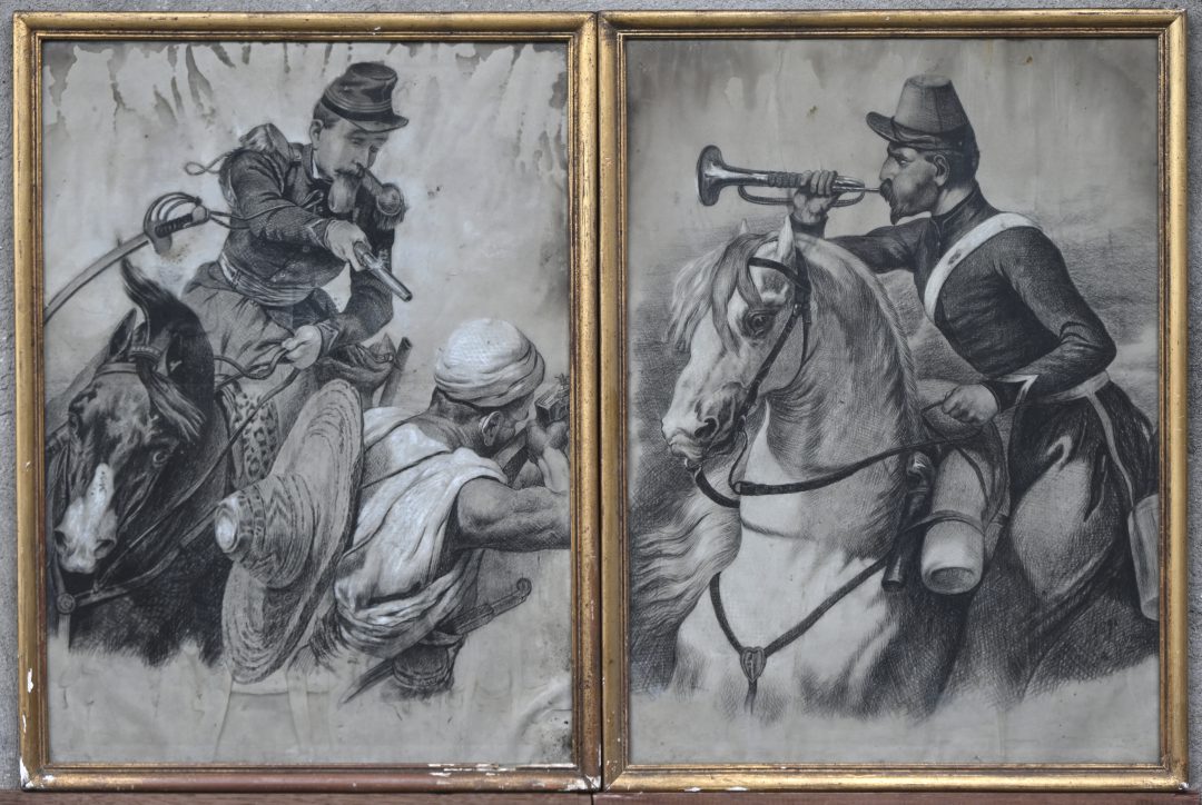 Twee opgehoogde tekeningen van 19e eeuws strijdgewoel te paard. Gedateerd 1890 en 1891. Getekend ‘Courtois’.
