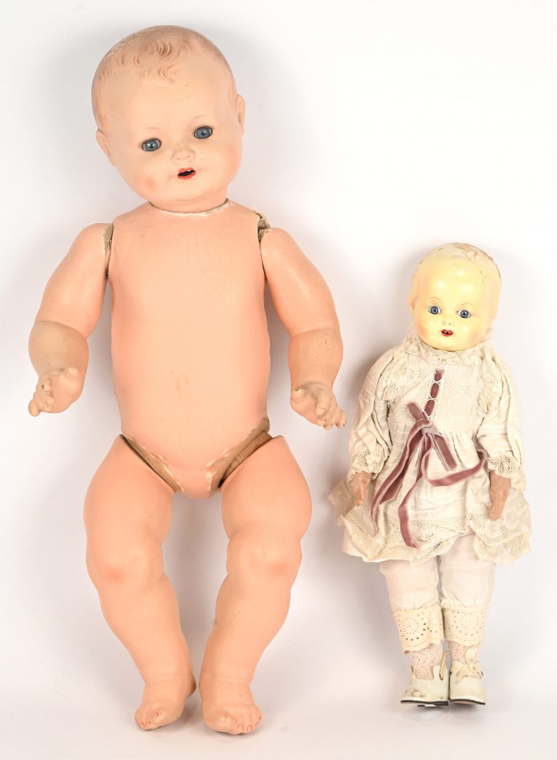 Twee oude poppen. Eén volledig van papier maché en één met een hoofd van papier maché en lichaam van opgevuld textiel.