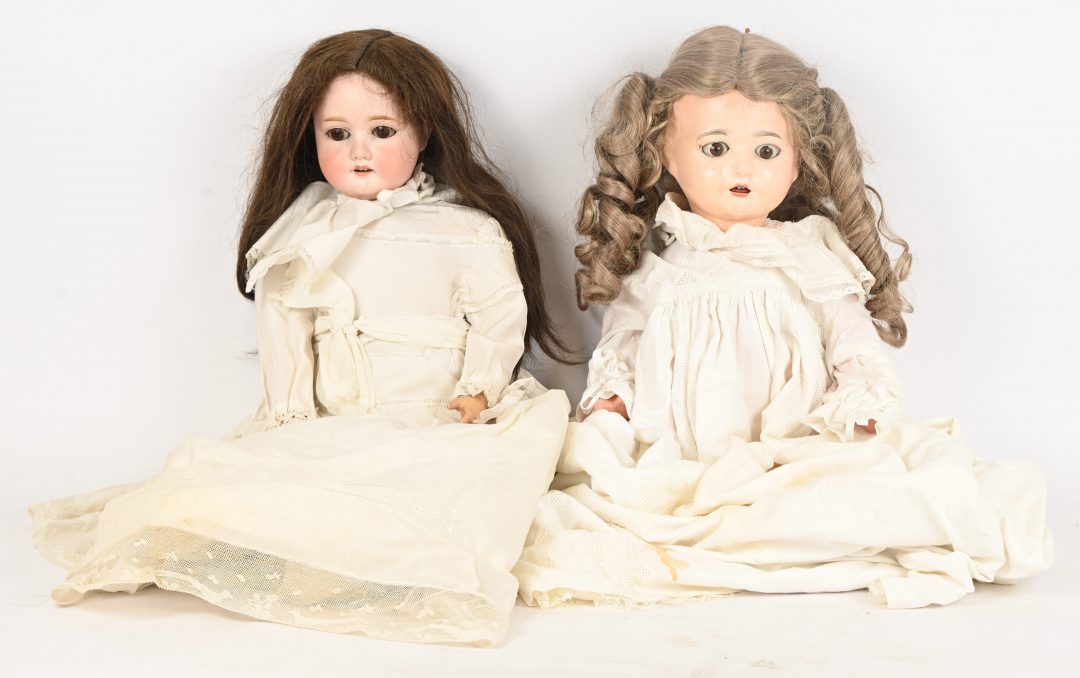 Twee oude poppen van papier mache, één pop heeft een porseleinen hoofd van ‘Schoenau & Hoffmeister 1909’. Toegevoegd twee extra kapsels.
