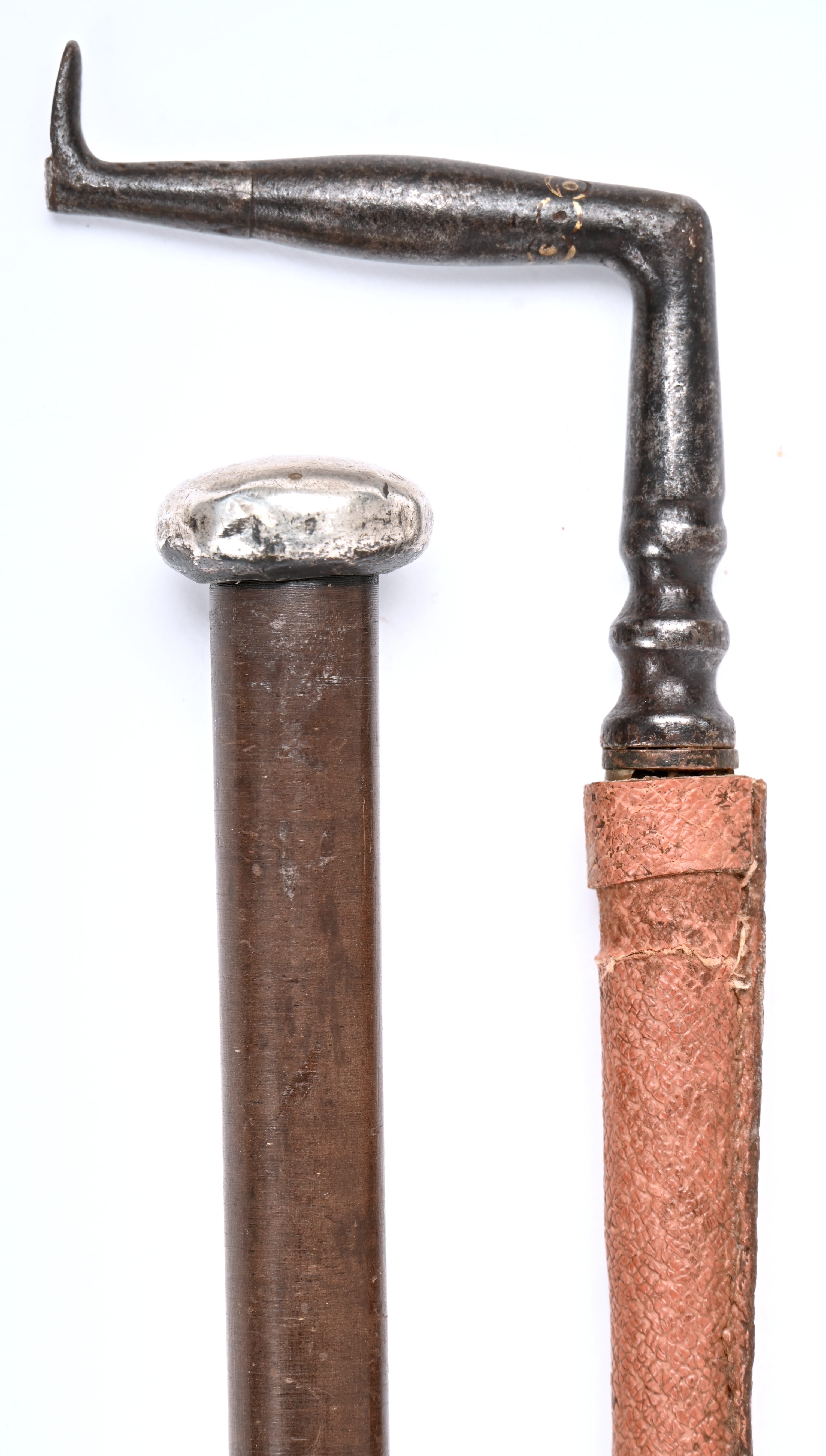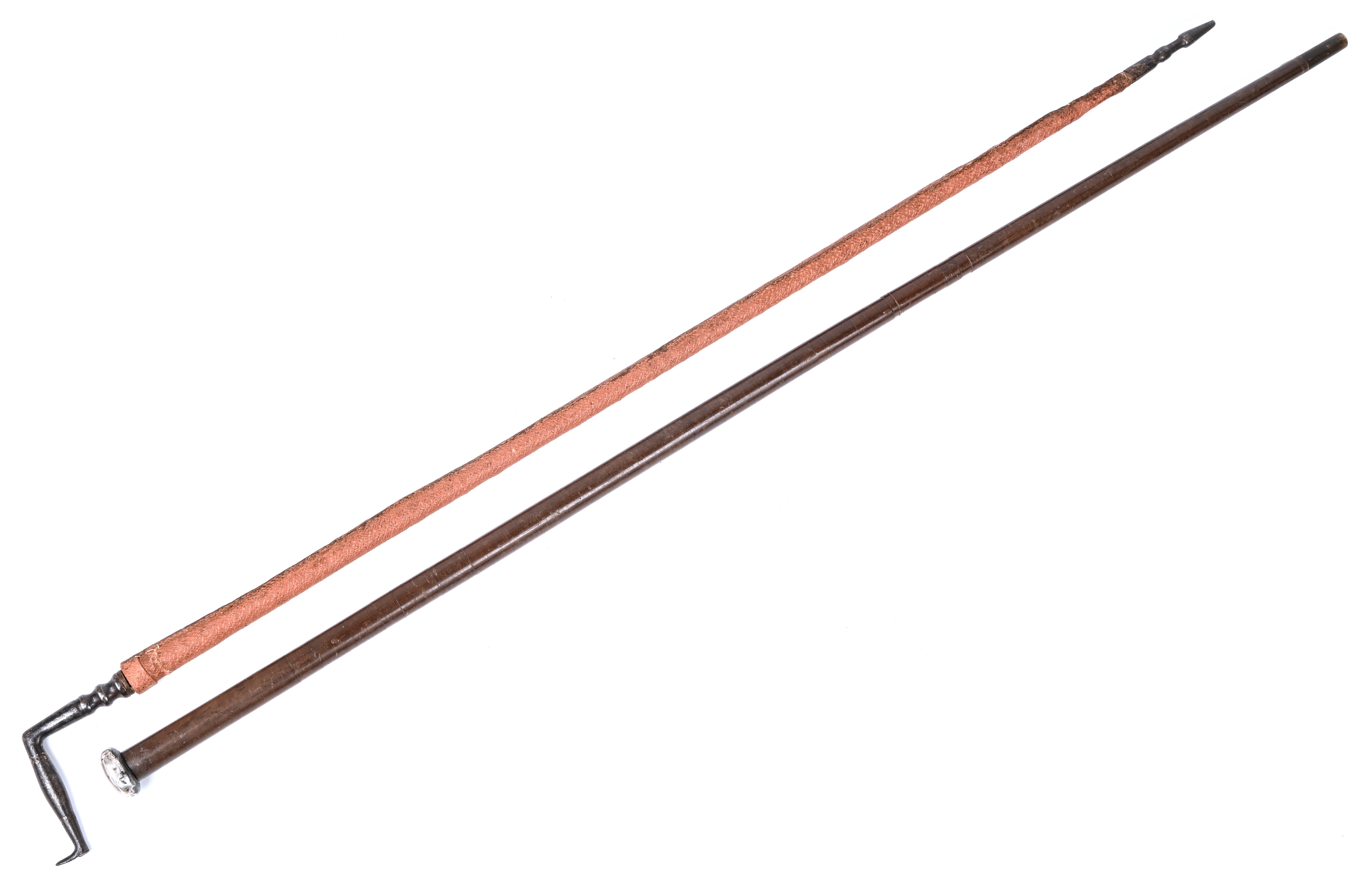 Twee oude wandelstokken van leder rond een ijzeren kern. Eén met een verzilverde kop en een met een handvat in de vorm van een gelaarsd been.