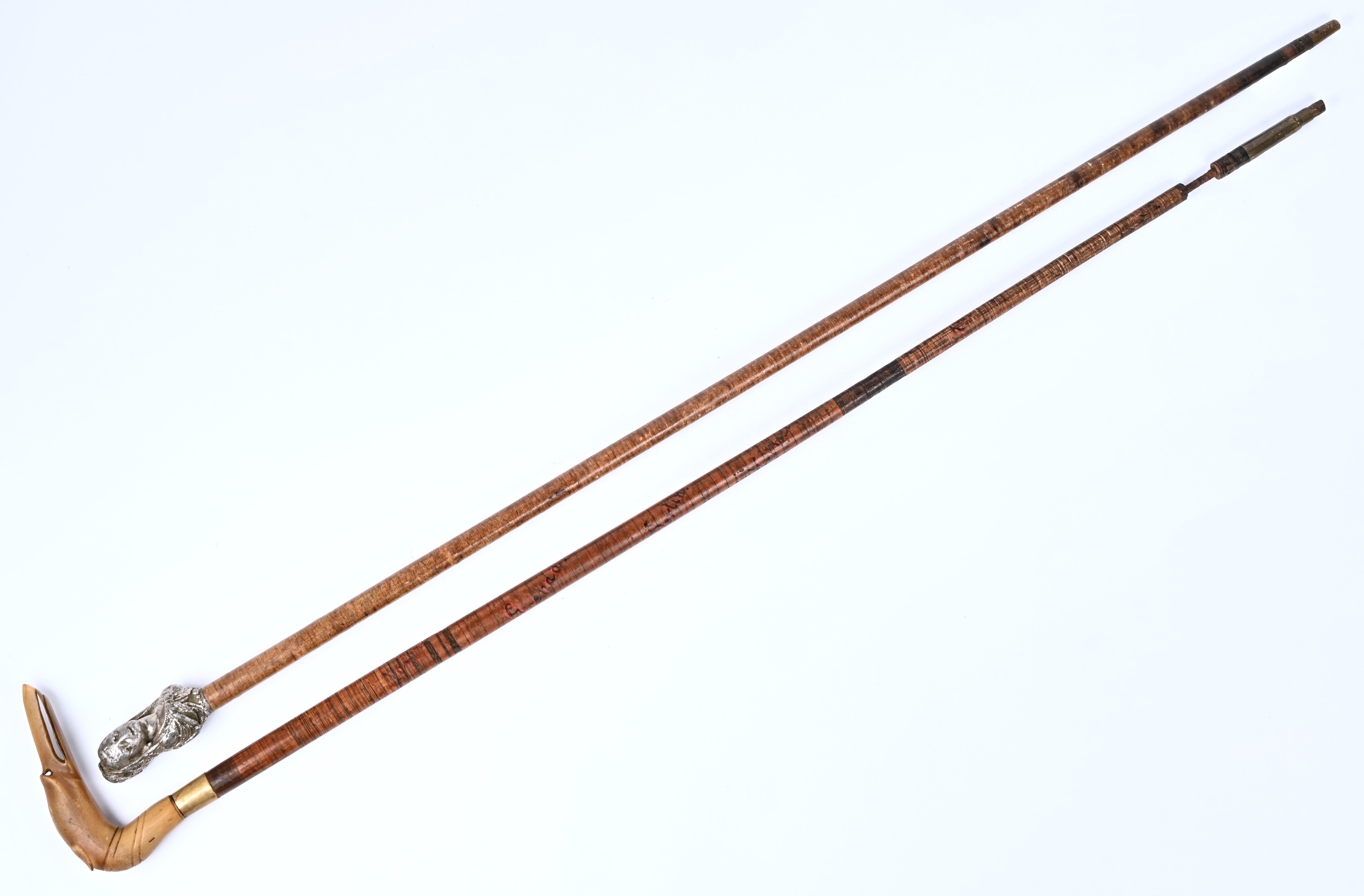 Twee oude wandelstokken van leder rond een ijzeren kern. Eén met een verzilverde kop in de vorm van een Spaanse vrouw en een hondekop van been.