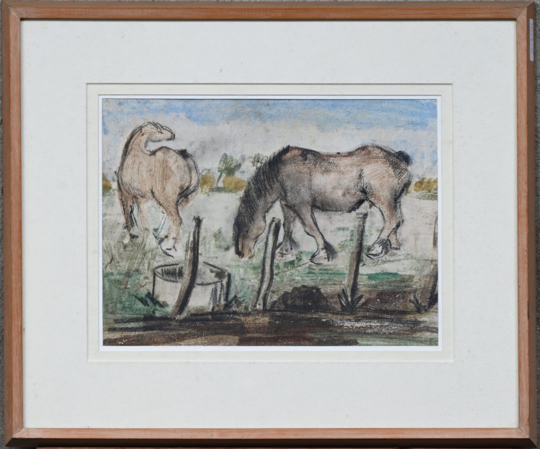 “Twee paarden”, een tekening, gemengde techniek op papier, niet gesigneerd.