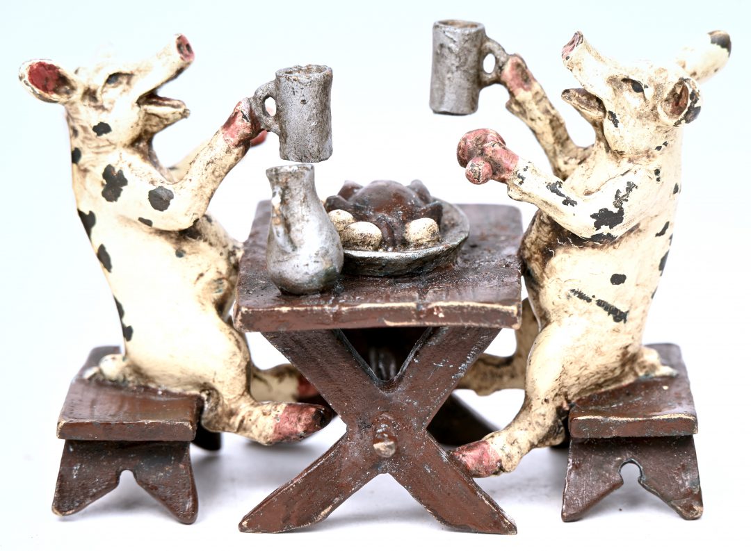 #17Een bronzen beeldje van een cartooneske haan op wit marmeren sokkeltje.