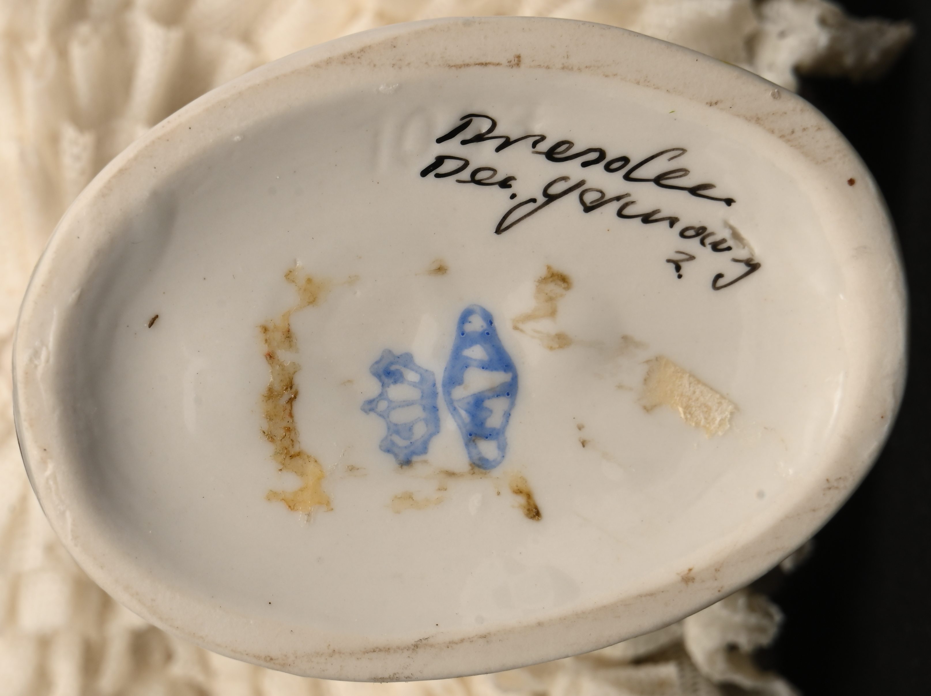 Twee porseleinen beeldjes van dames in kantporseleinen jurk, gemerkt Dresden. Minieme schade aan het kant.