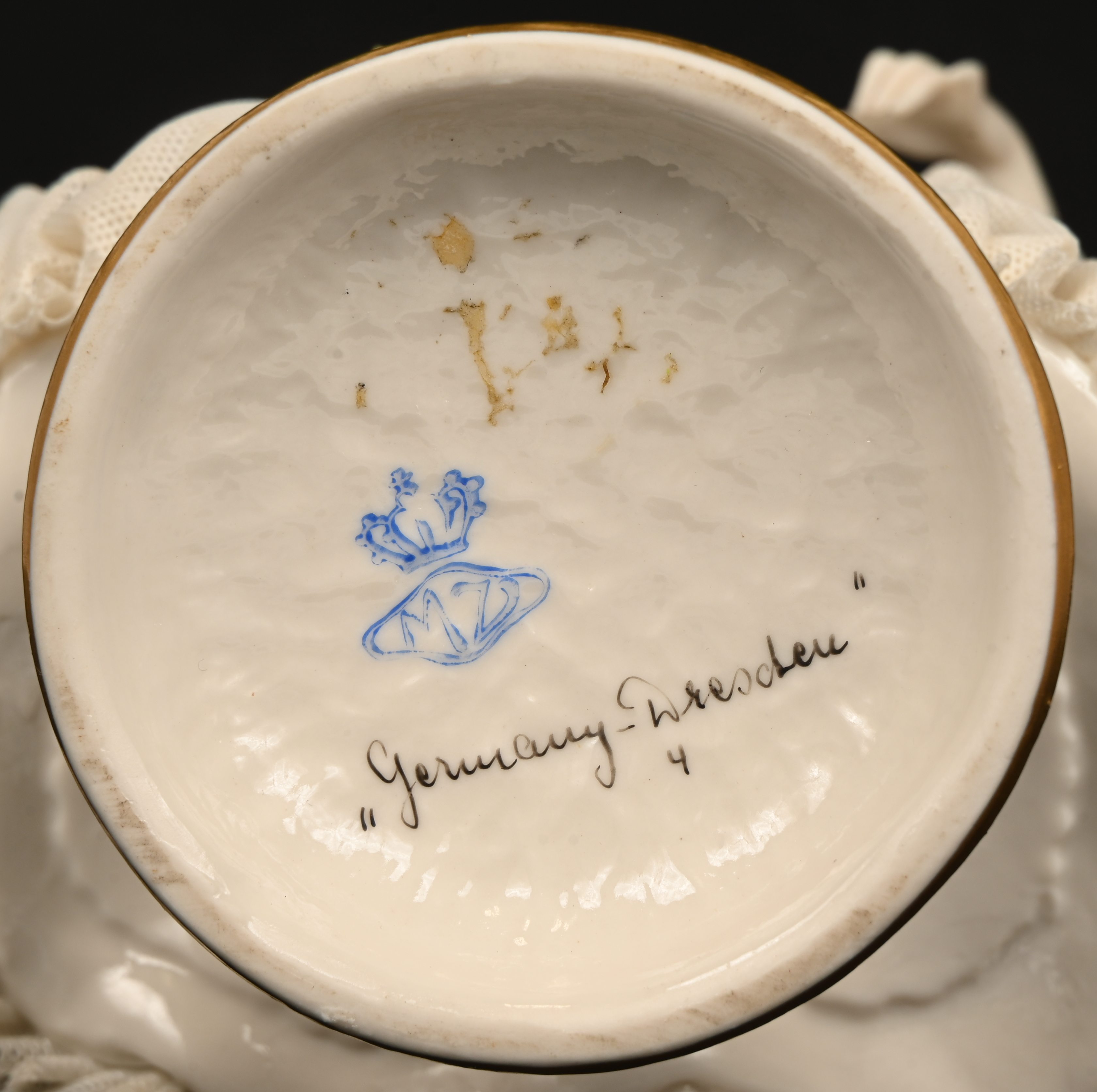 Two porcelain figurines of ladies in lace porcelain dresses, marked Dresden. Minimal damage to the lace.