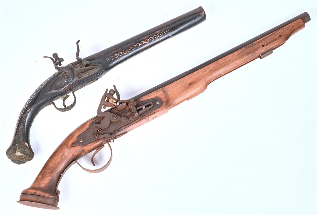 Two replica flintlock pistols.