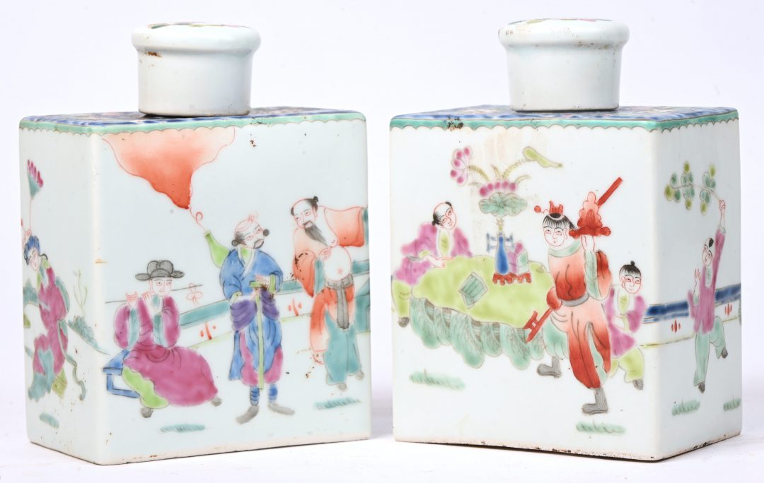 Twee theebussen van meerkleurig Chinees porselein met figuren in het decor.