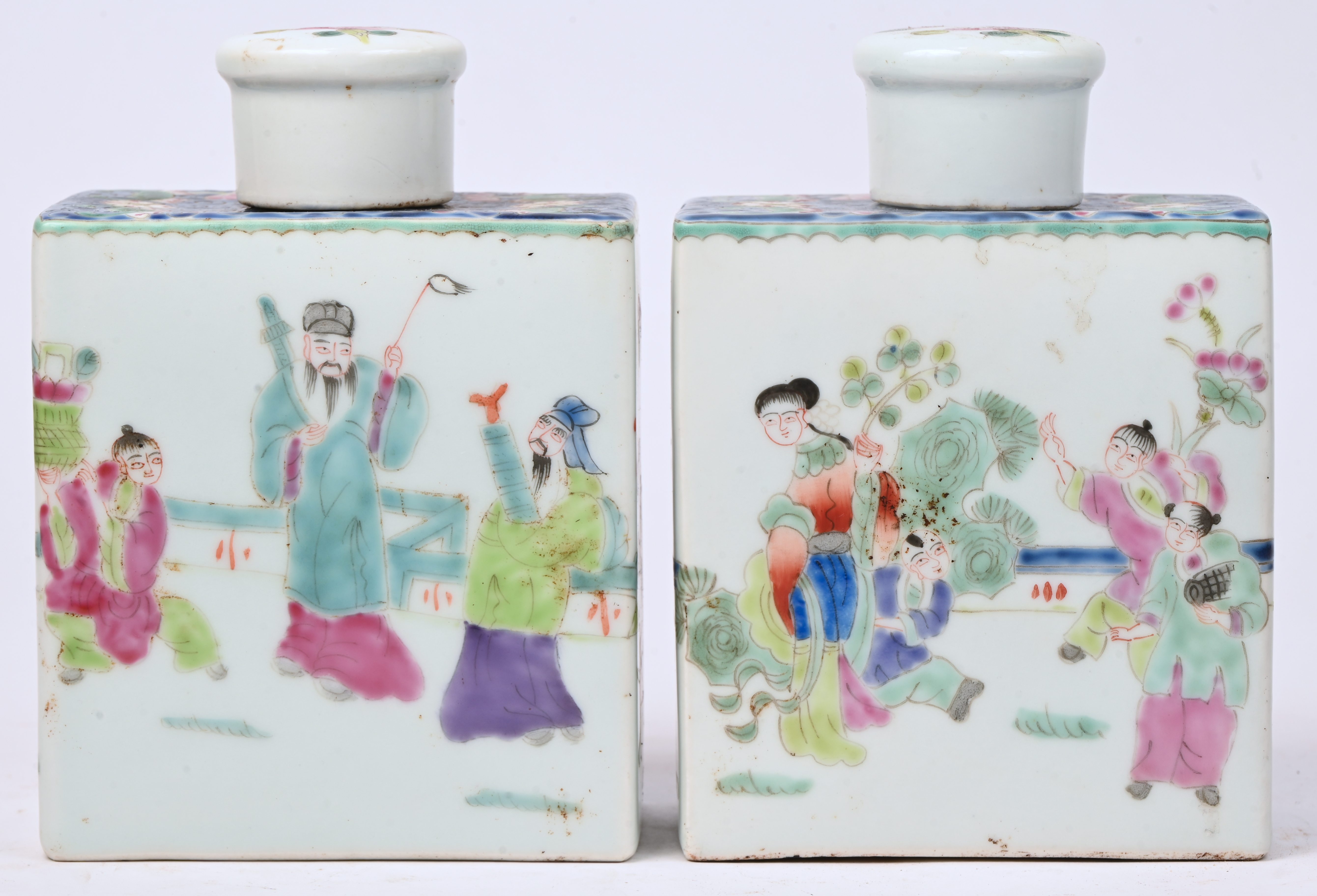 Two tea caddies of polychrome Chinese porcelain with figures in the decoration.