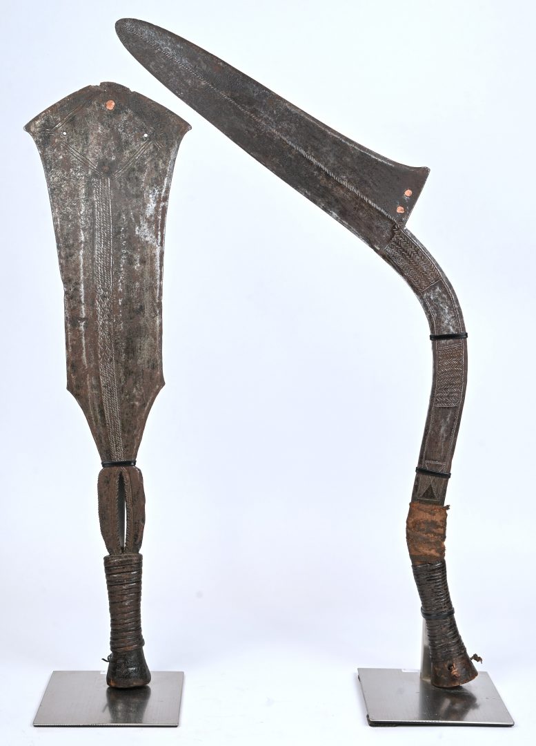 Twee traditionele Afrikaanse wapens. Een Azande zwaard en een Konda machette.