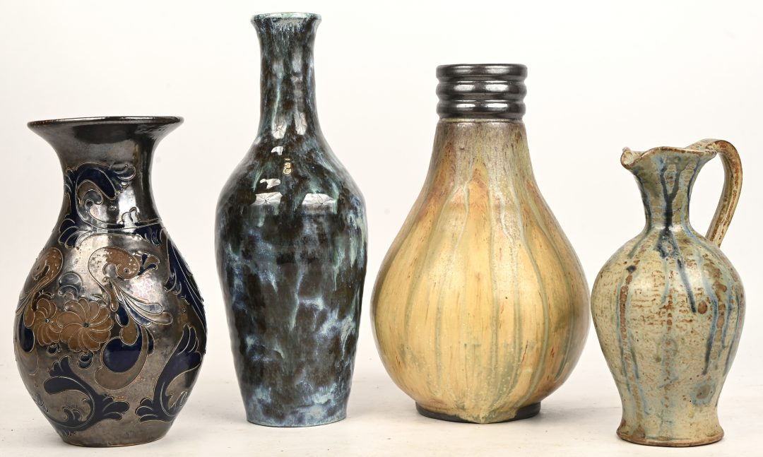 A lot of 3 vintage ceramic items, 2 W. Germany vases, and a vide poche. The largest vase has been repaired at the base. -