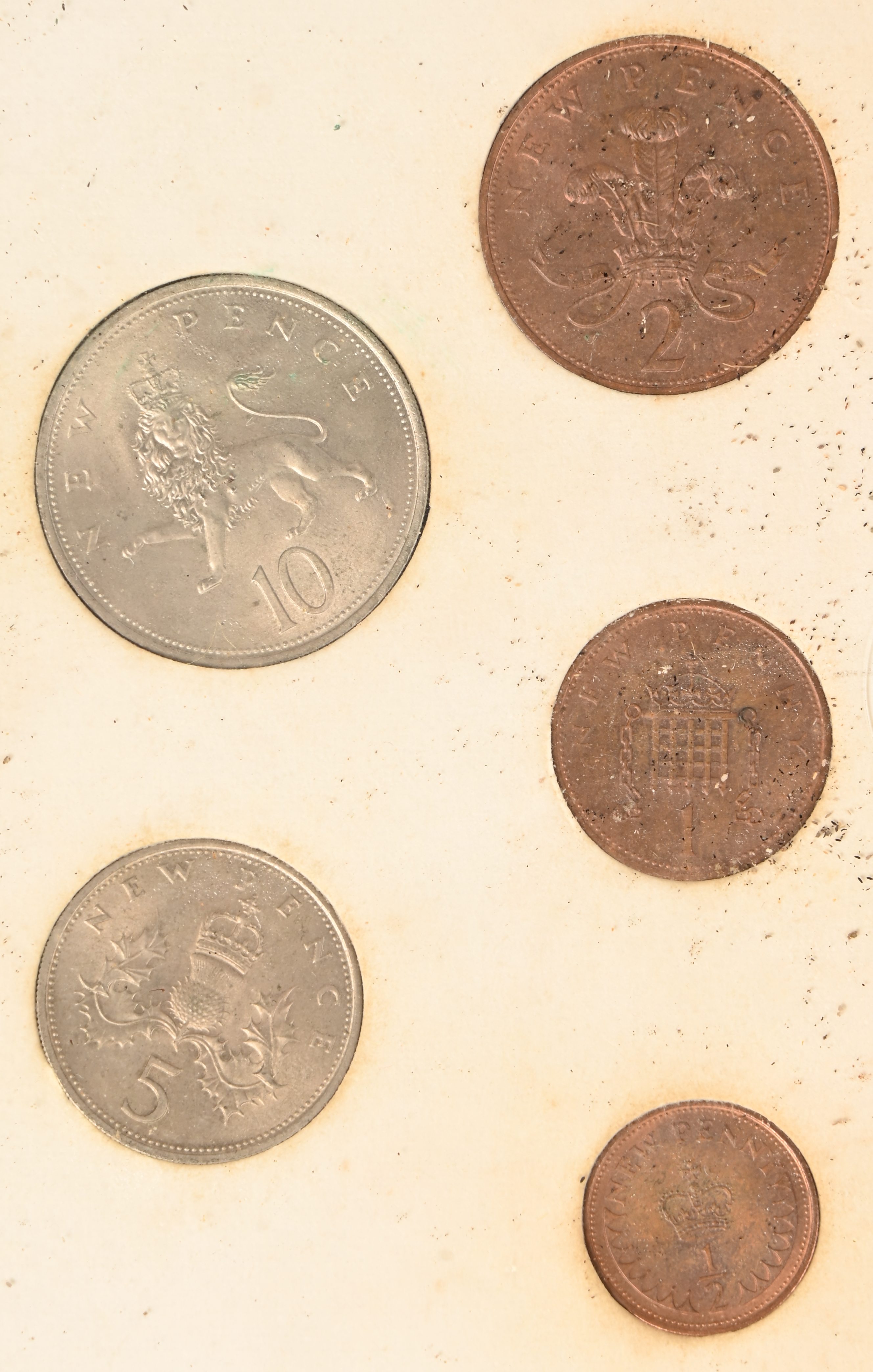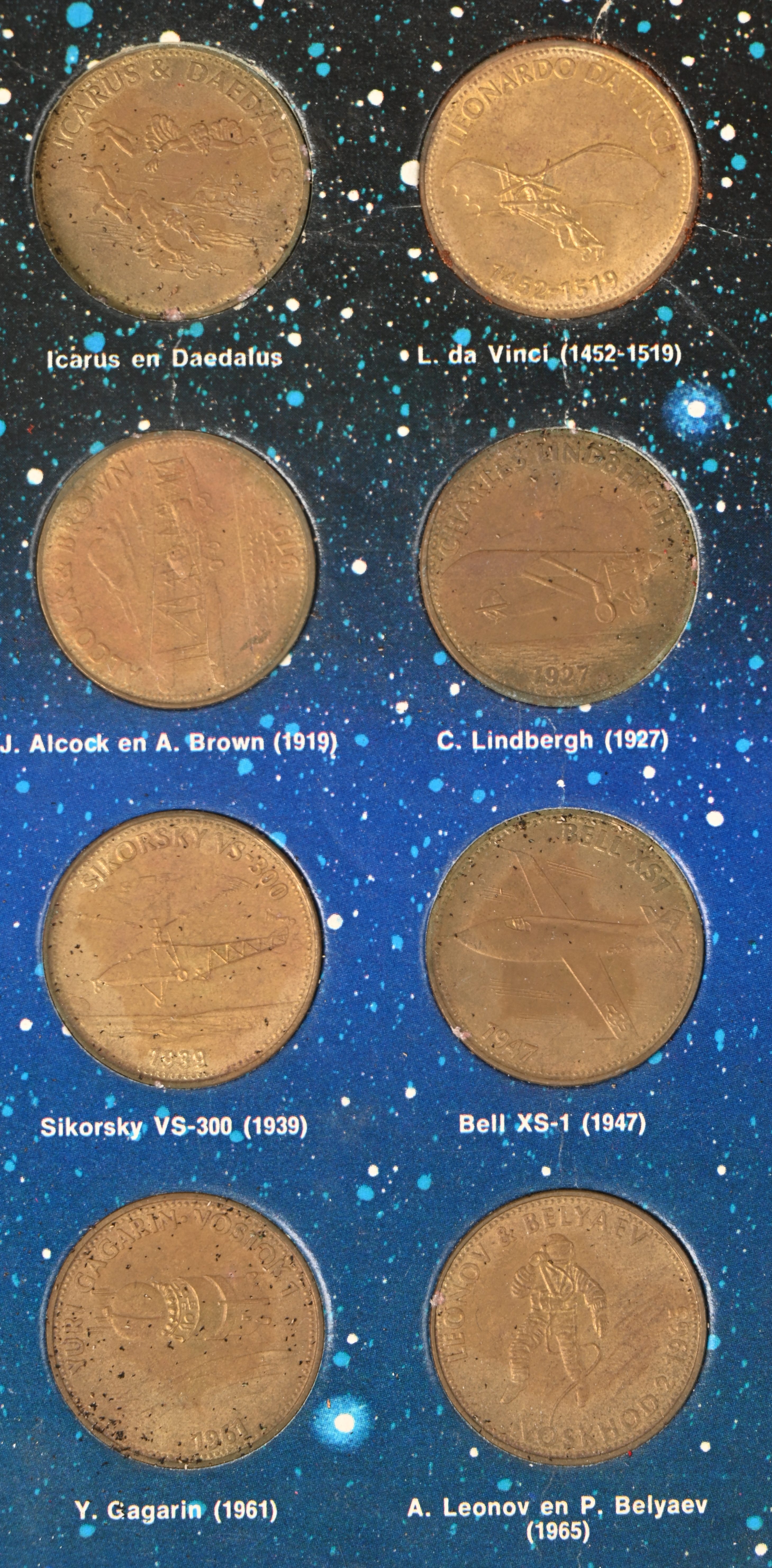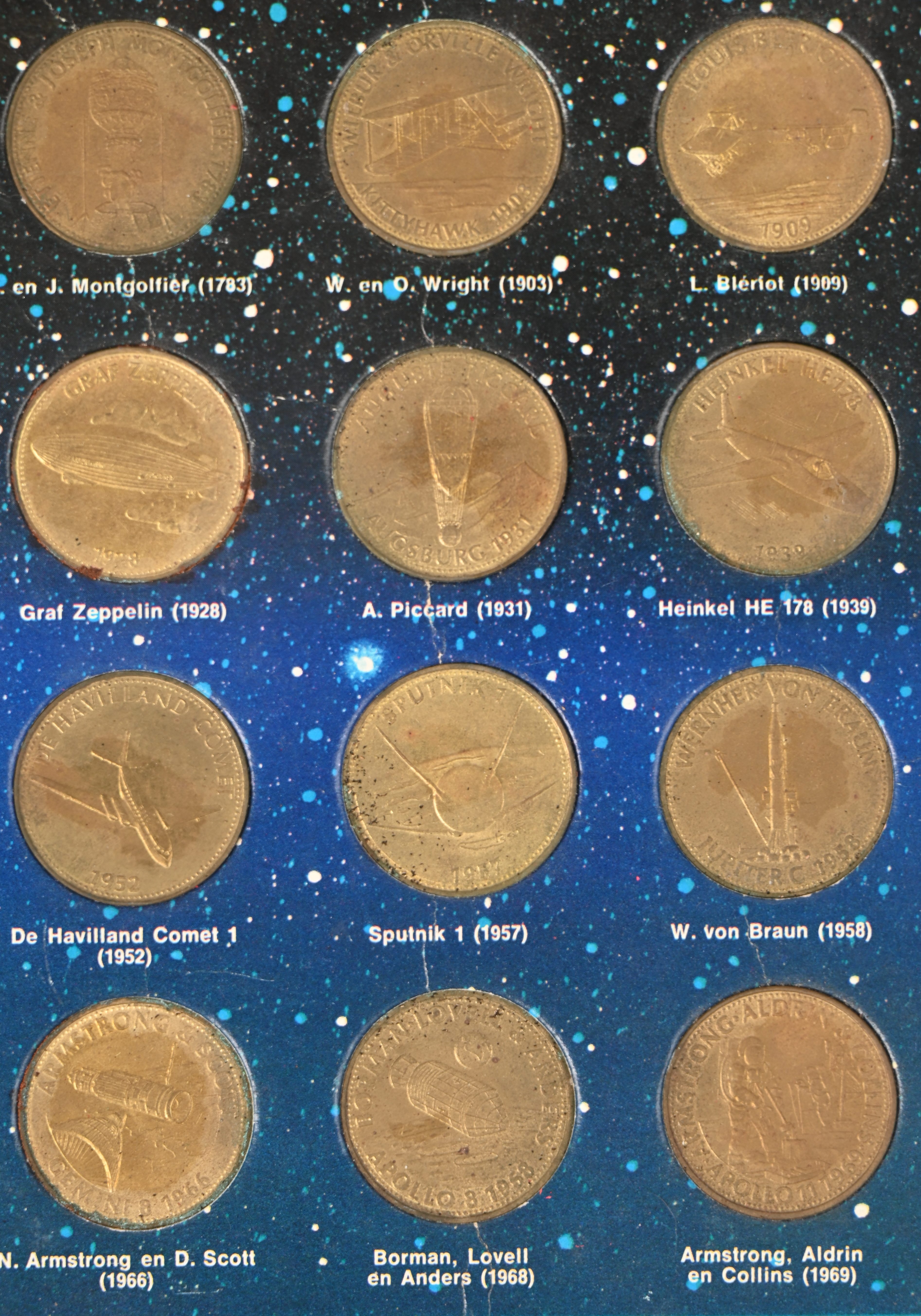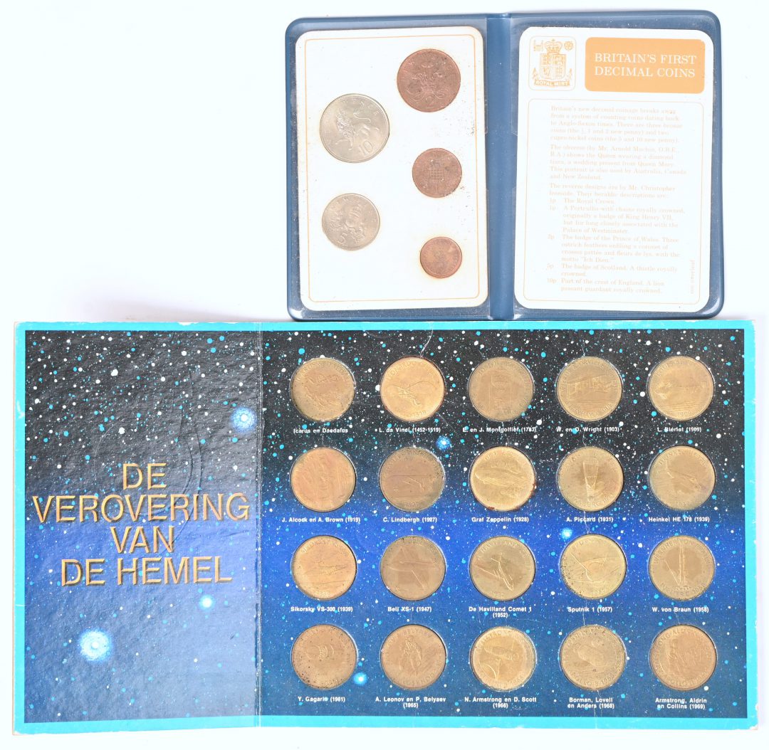 Twee verzamelmapjes met munten: Britain’s first decimal coins en De verovering van de hemel.