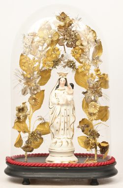 #201Een oude ovalen stolp met hierin een Madonna in Brussels porselein.