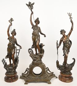 #189Een zamakken klokstel waarvan de klok ontbreekt met 2 beelden op houten sokkel.