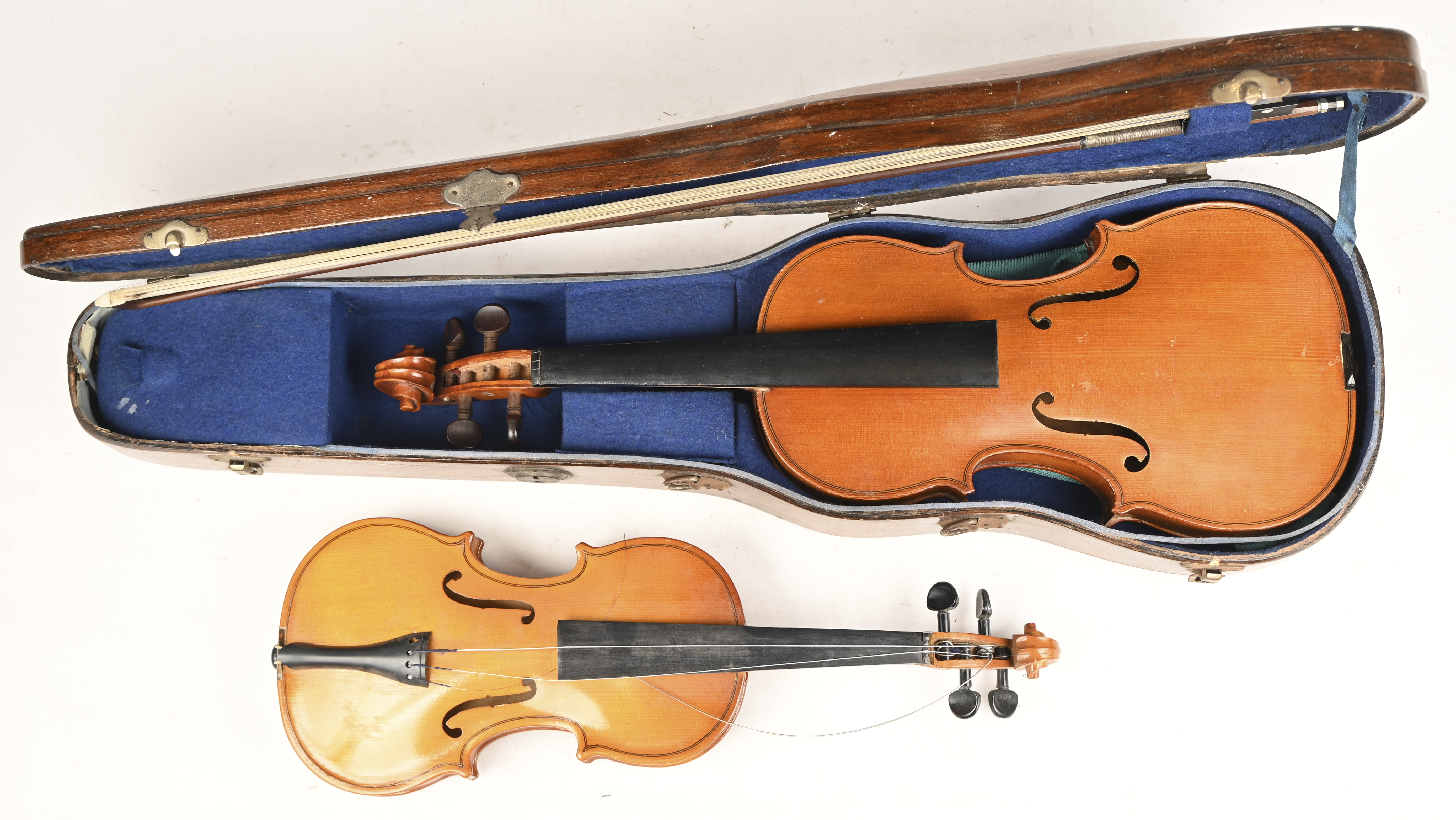 Twee violen, waarvan één in koffer met strijkstok en reserve onderdelen. Het junior model heeft een Russisch label.