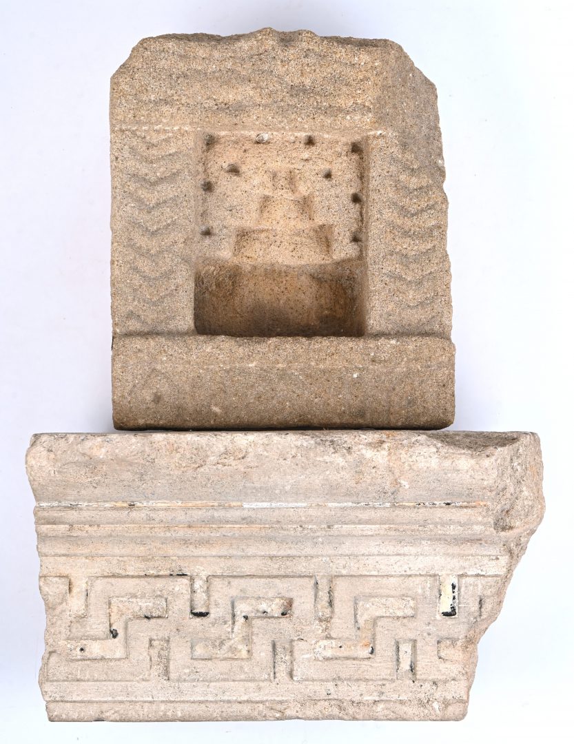 Two sandstone ornaments. A small niche and a fragment of a frieze.