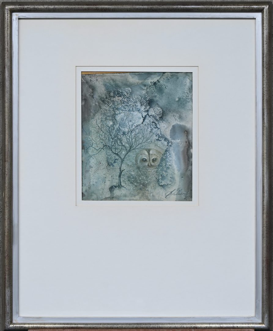 “Uil in het bos”, een aquarel op papier, gesigneerd.