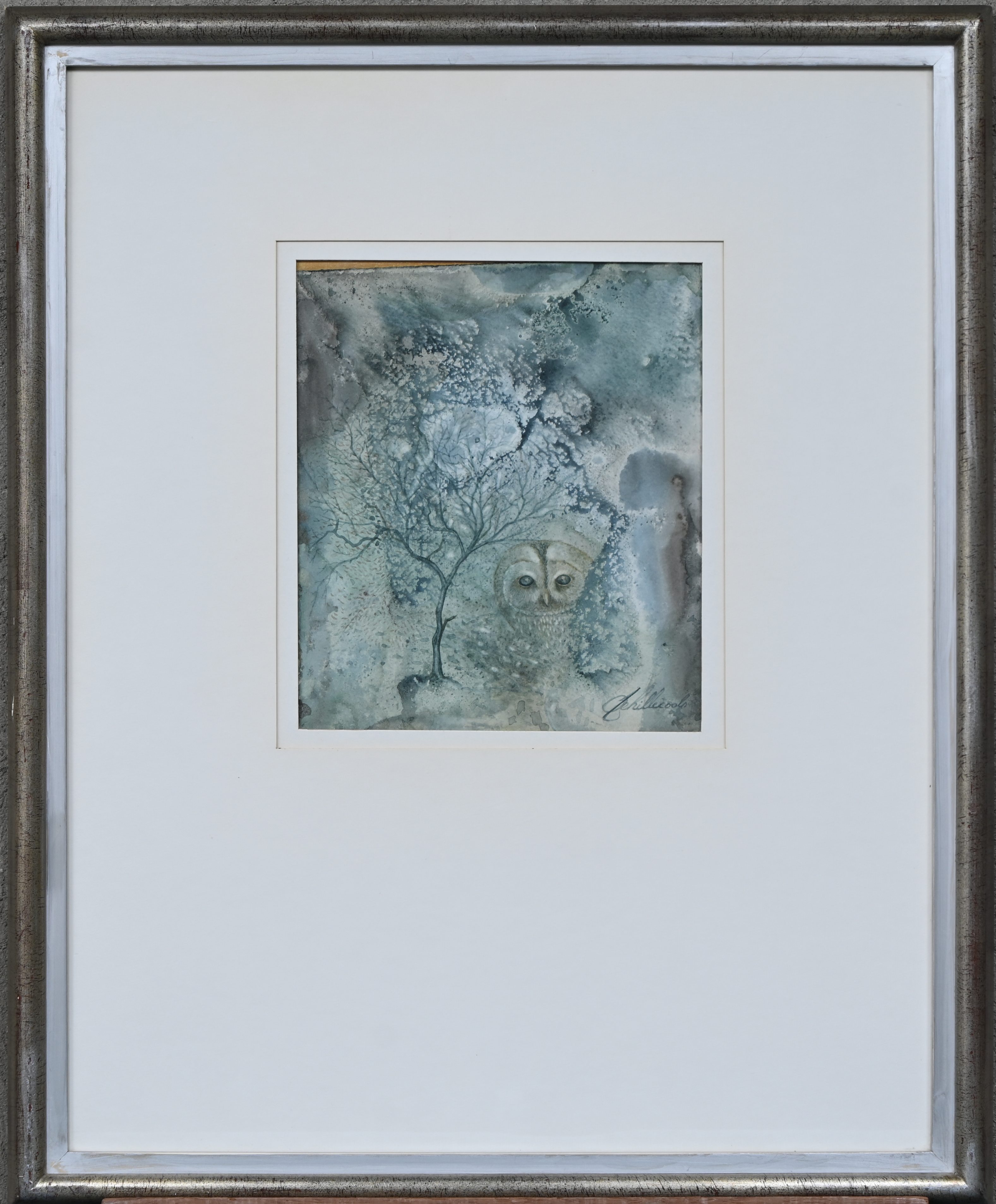"Owl in the forest," a watercolor on paper, signed.