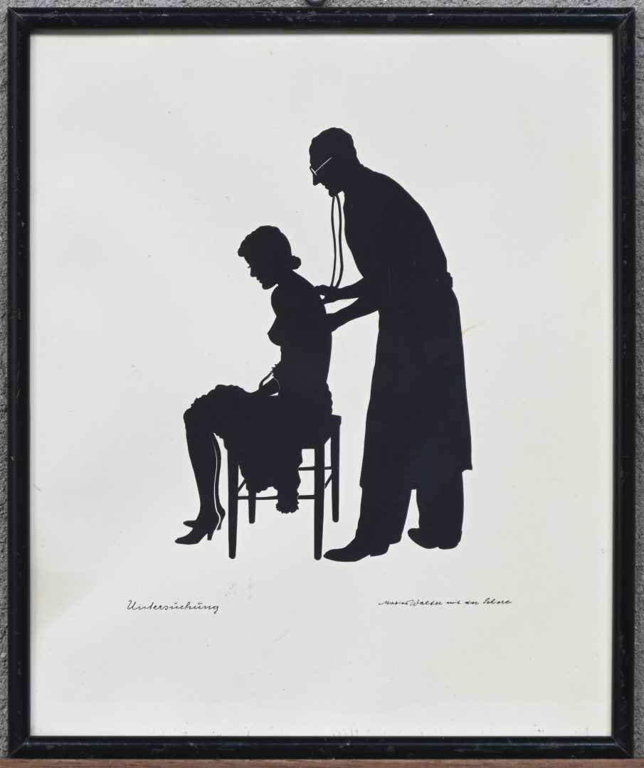 “Untersuchung”, een handgeknipte silhouette met als onderwerp een doktersonderzoek. Gesigneerd Matias Walter mit der schere.