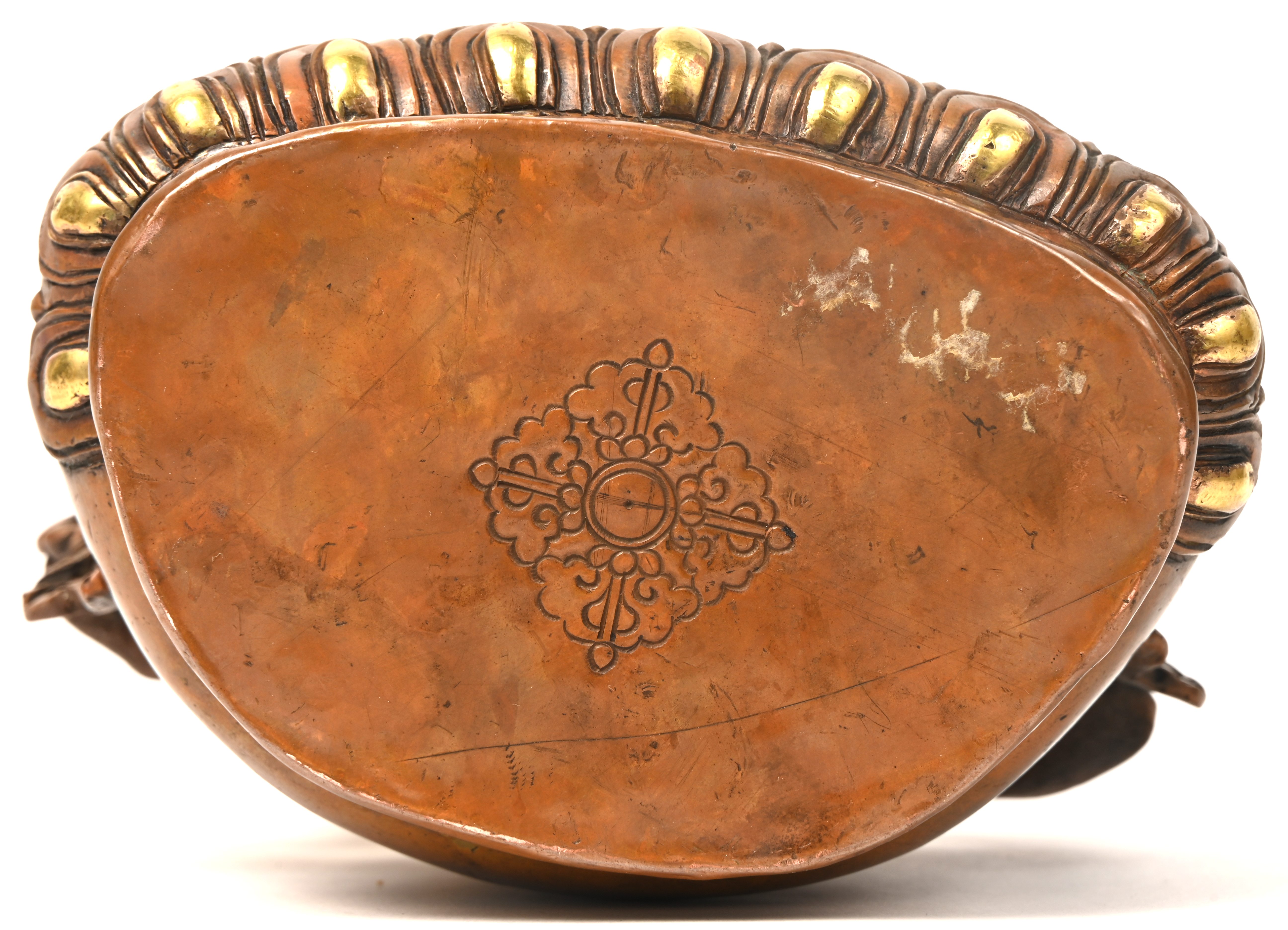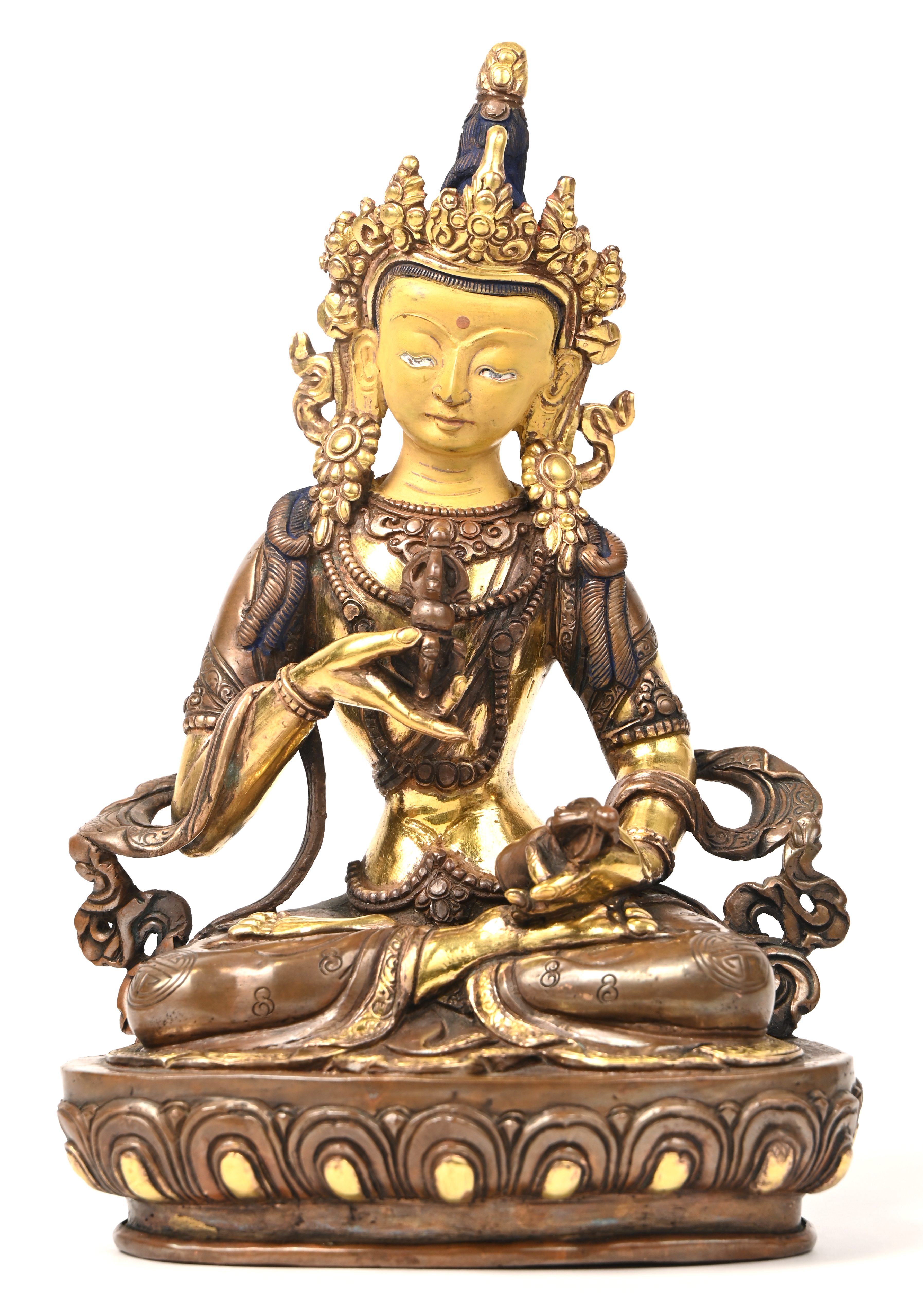 Vajradhara, een Nepalese Boedha beeldje van gapatineerd brons, op een lotusbloem gezeten. Met beschildering aan het gelaat en de hoofdtooi.