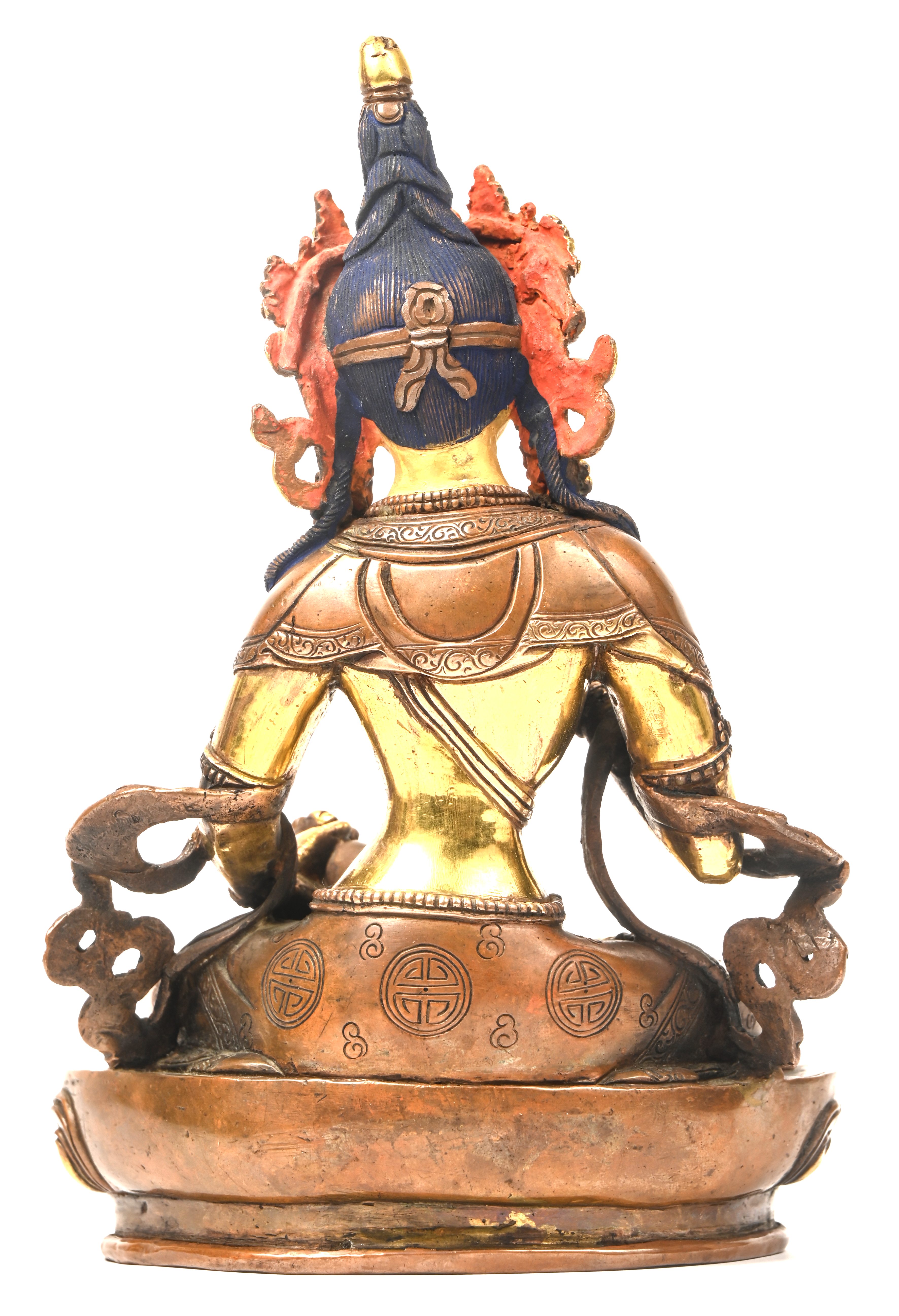 Vajradhara, a Nepalese Buddha figure in patinated bronze, seated on a lotus flower. With painted face and headdress.