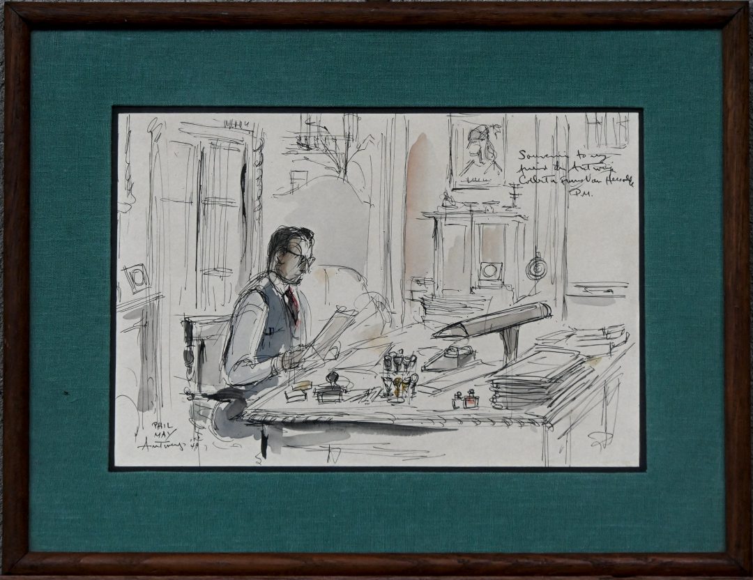 'Van Heesvelde in his office', ink and watercolor on paper. Signed Phil May, Antwerp, '49.