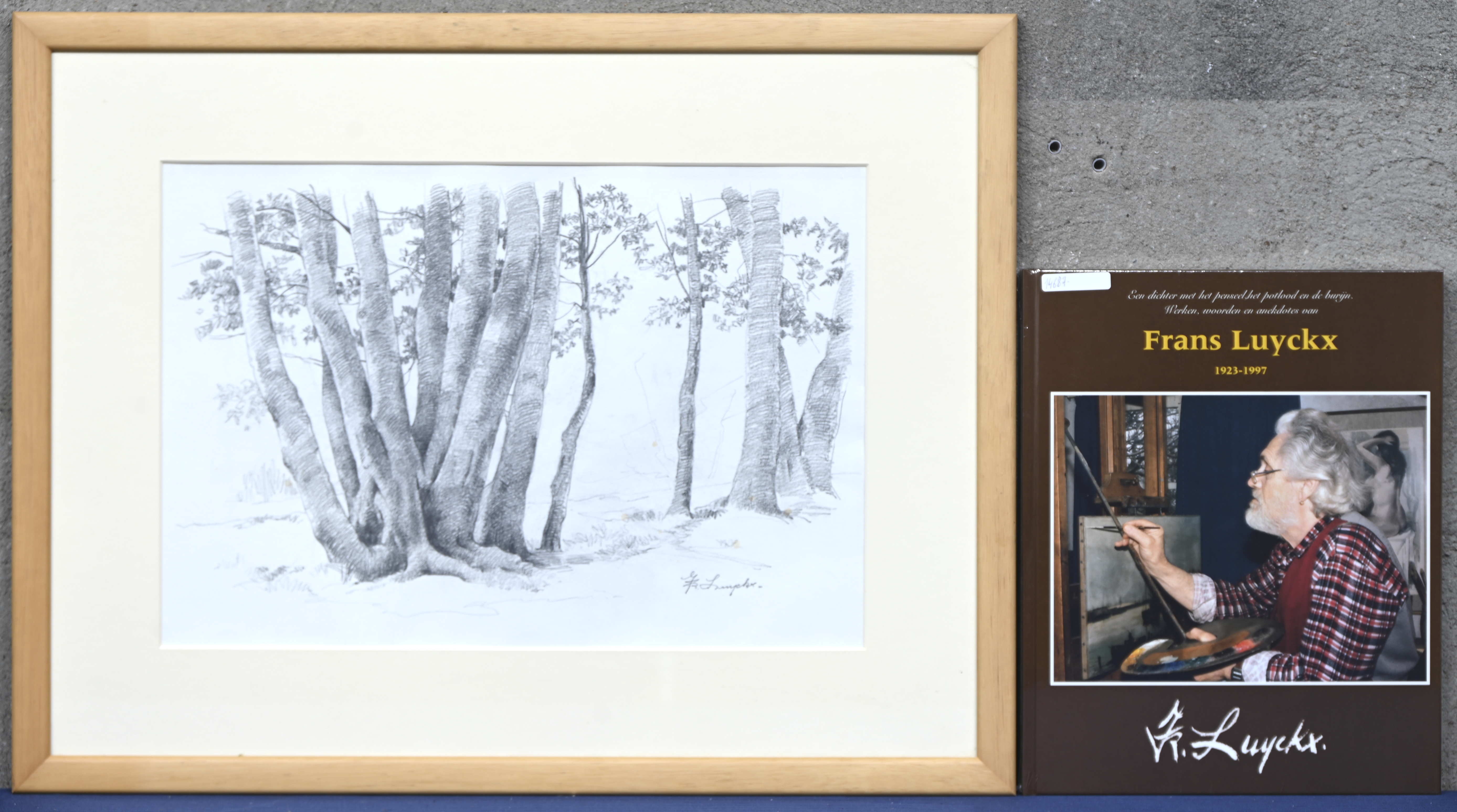 ‘Verzamelde bomen’, een potloodtekening. Getekend Fr. Luyckx. Toegevoegd een boek over het werk van de kunstenaar.