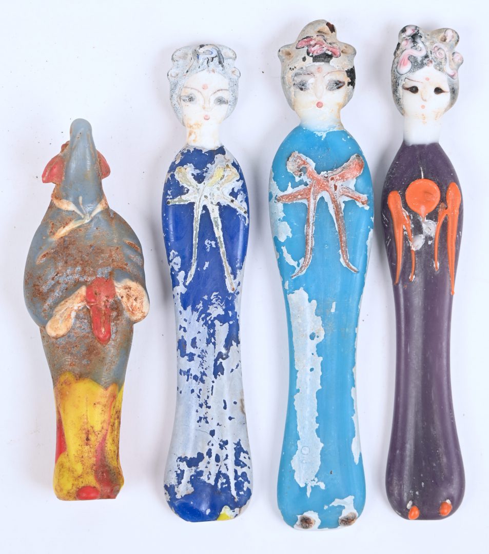Vier Chinese sculptuurtjes van meerkleurig glaspaste: drie vrouwen en een zodiac dier. In de stijl van de Ming Dynastie.