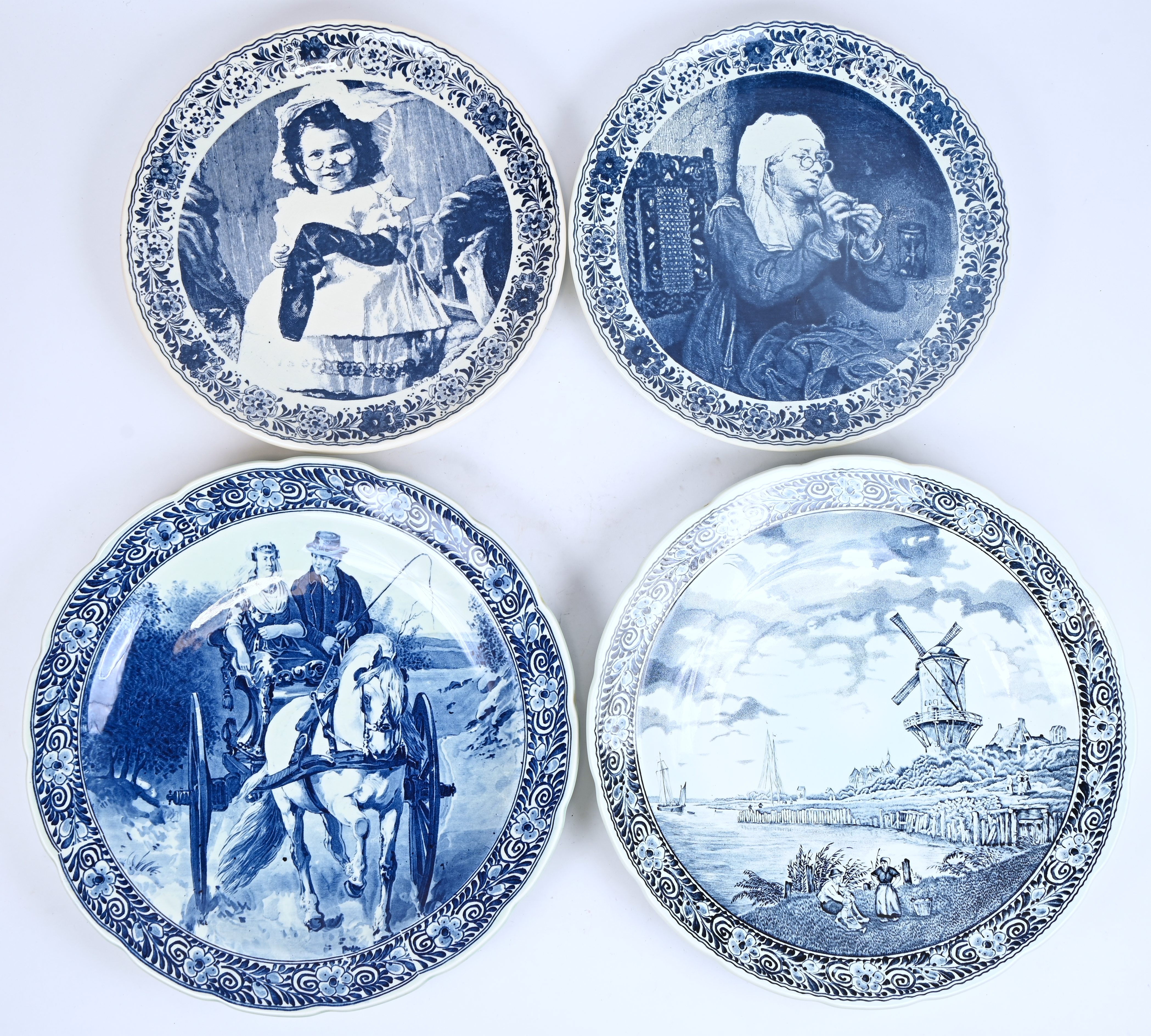 Four large decorative plates of blue-and-white glazed earthenware.