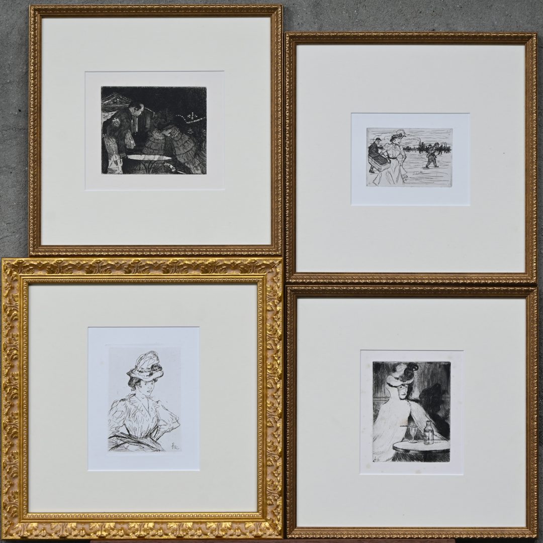 Four monochrome etchings by Henri Evenepoel. Reprints of the original plate with embossing from a print room.