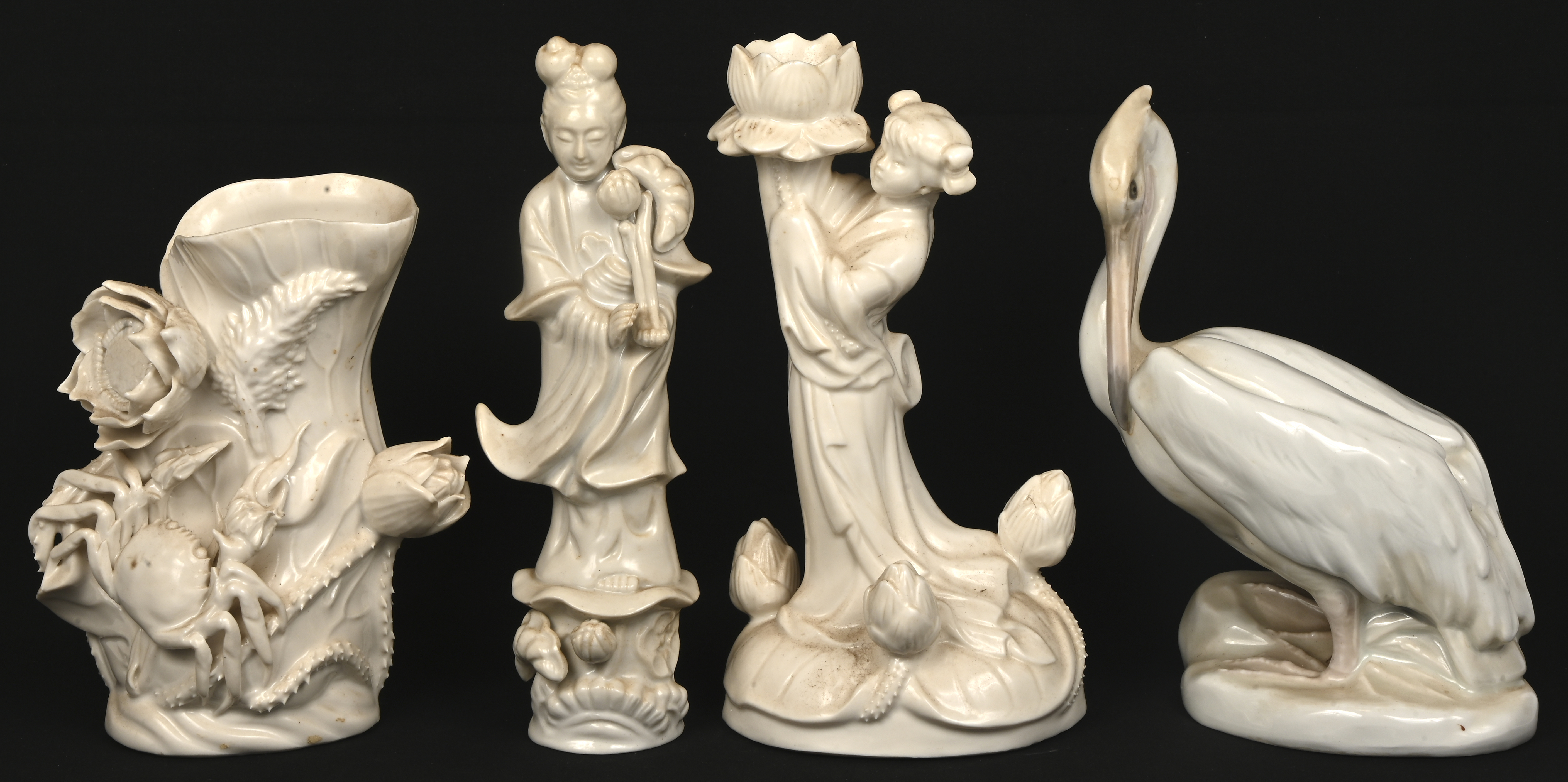 Vijf beeldjes van porselein. Een putto met een wereldbeeld, een moeder met kind, een kandelaar met personage, twee paters en een monochroom groepje van twee kinderen met een kooi.