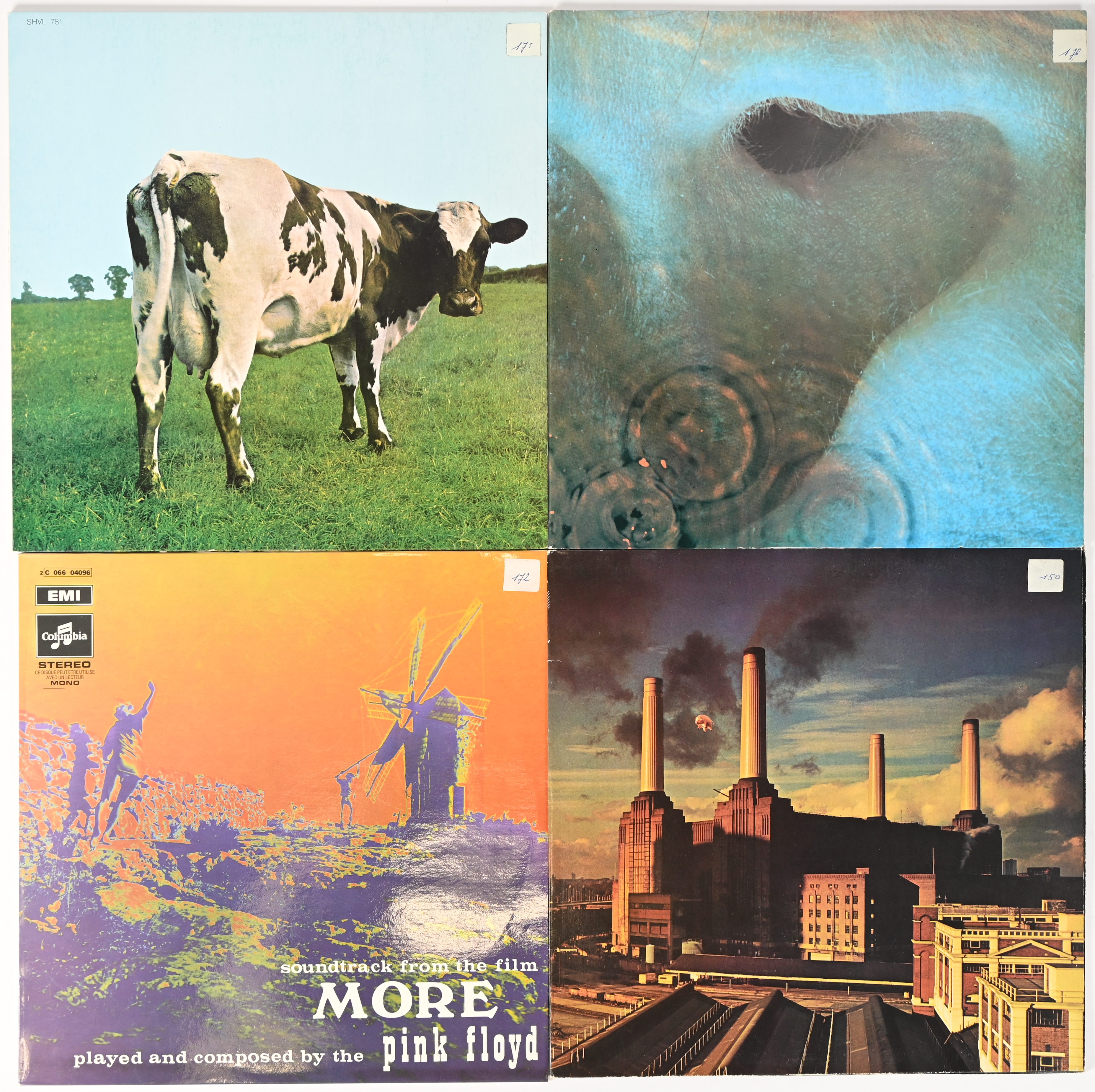 Vier vinylplaten: Pink Floyd: Soundtrack from the film More - 066-04096, Franse persing, Animals - 064-98 434, Duitse persing, Meddle - 064-04917, Franse persing en Atom Heart Mother - 064-04550, Franse persing.