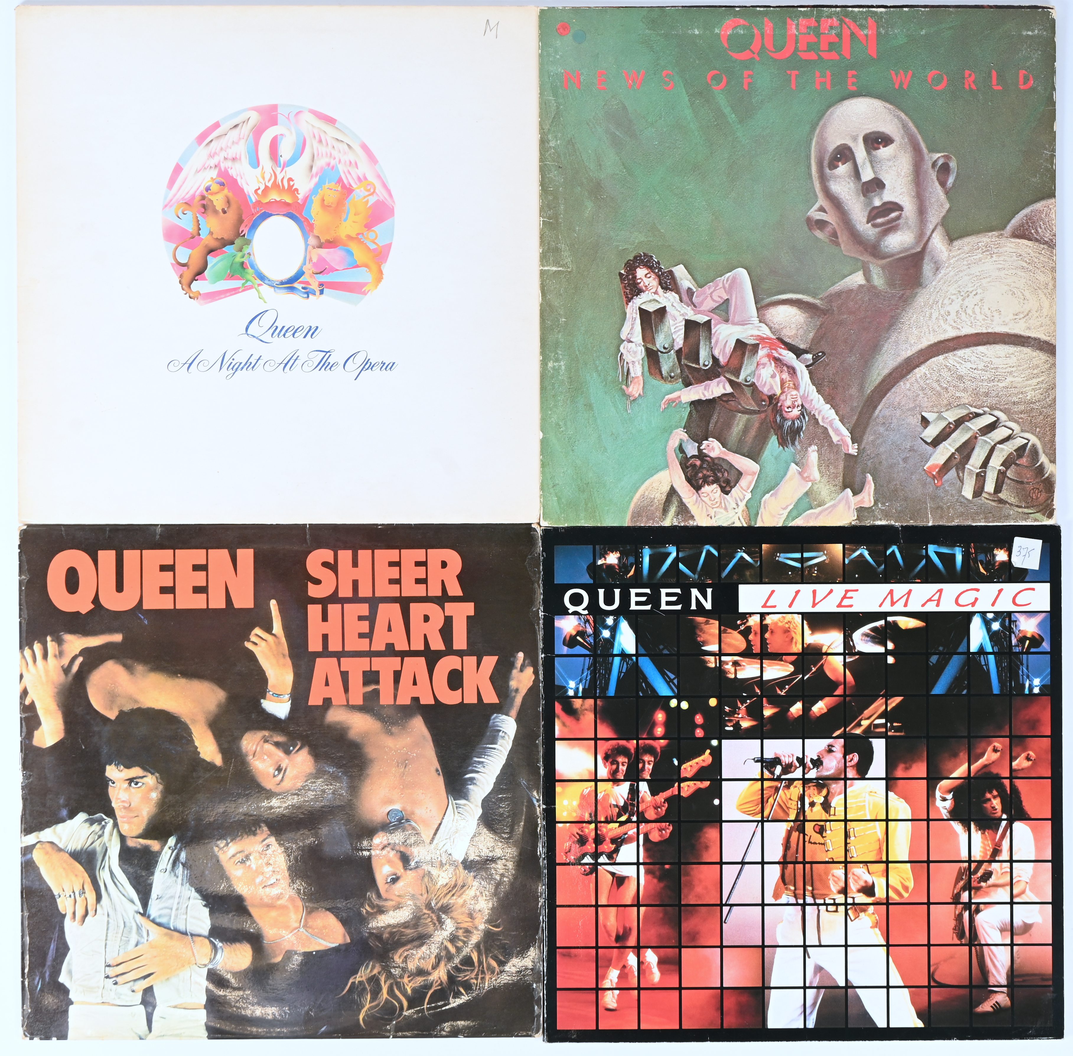 Four vinyl records: Queen: News of the World - 064-60 033, Sheer Heart Attack - 5C 062 96025, Live Magic - 24 0675 1 and A Night at the Opera - OC 066 97176.