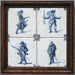 #245Vier antieke tegels met de beeltenissen van soldaten in kader, 19e eeuws.