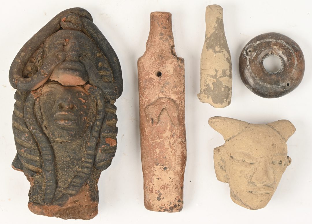 Vijf aardewerken voorwerpen in precolumbiaanse stijl. Bestaande uit twee hoofdjes, een fluit, een onderdeel van een fluit en een onbekend rond voorwerp.
