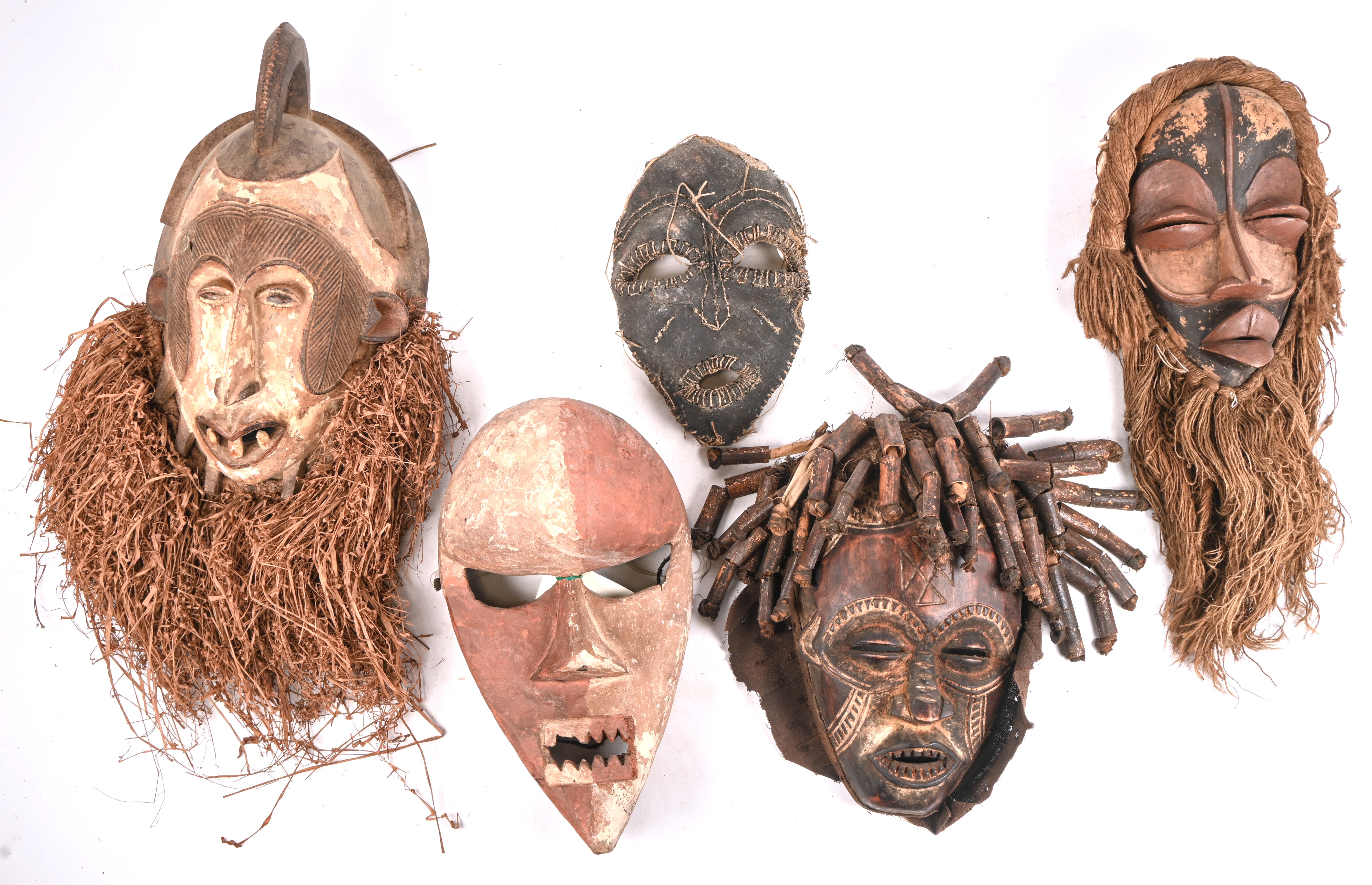 Five African masks including Salampasi (Democratic Republic of Congo), Tshokwe, and Igbo (Nigeria).