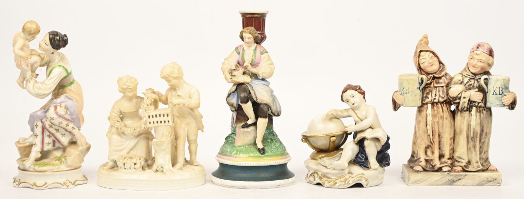 Three polychrome biscuit figurines. A boy with a donkey, a young couple under an umbrella, and an elegant couple with a horse (damage to an arm). -