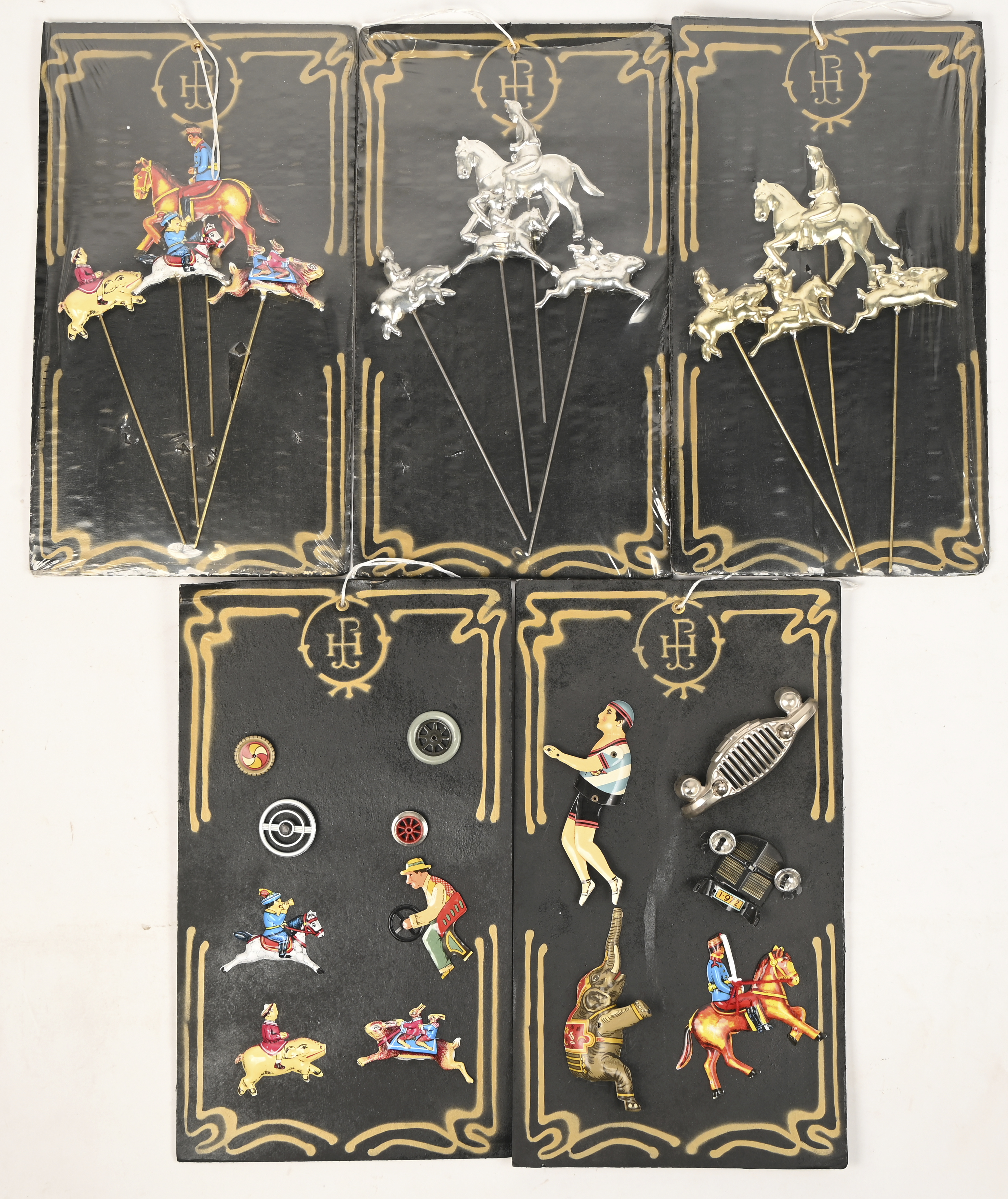 Five boxes of pins and figurines on a metal rod.