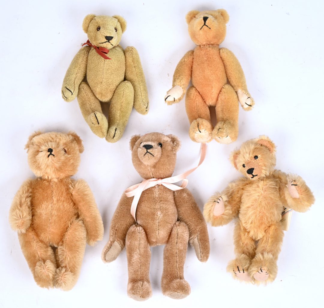 A set of five medium-sized teddy bears. Various brands, Dakin, Little Folk, Kerby, one unbranded, and one with unreadable brand. -