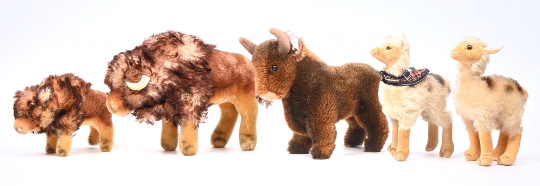 Vijf vintage pluche bokken, waarvan drie gemerkt Steiff, één met knop/label manco en één gemerkt Grisly.